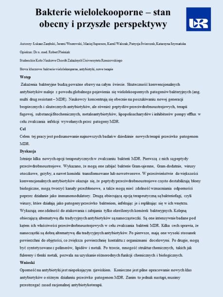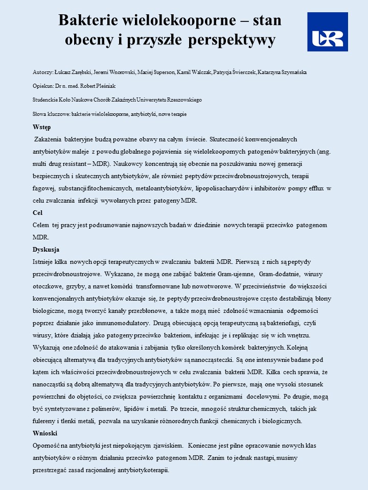48. Łukasz Zarębski, Jeremi Wnorowski, Maciej Superson, Kamil Walczak, Patrycja Świerczek, Katarzyna Szymańska ''Multi-drug resistant bacteria - current state and future perspectives''