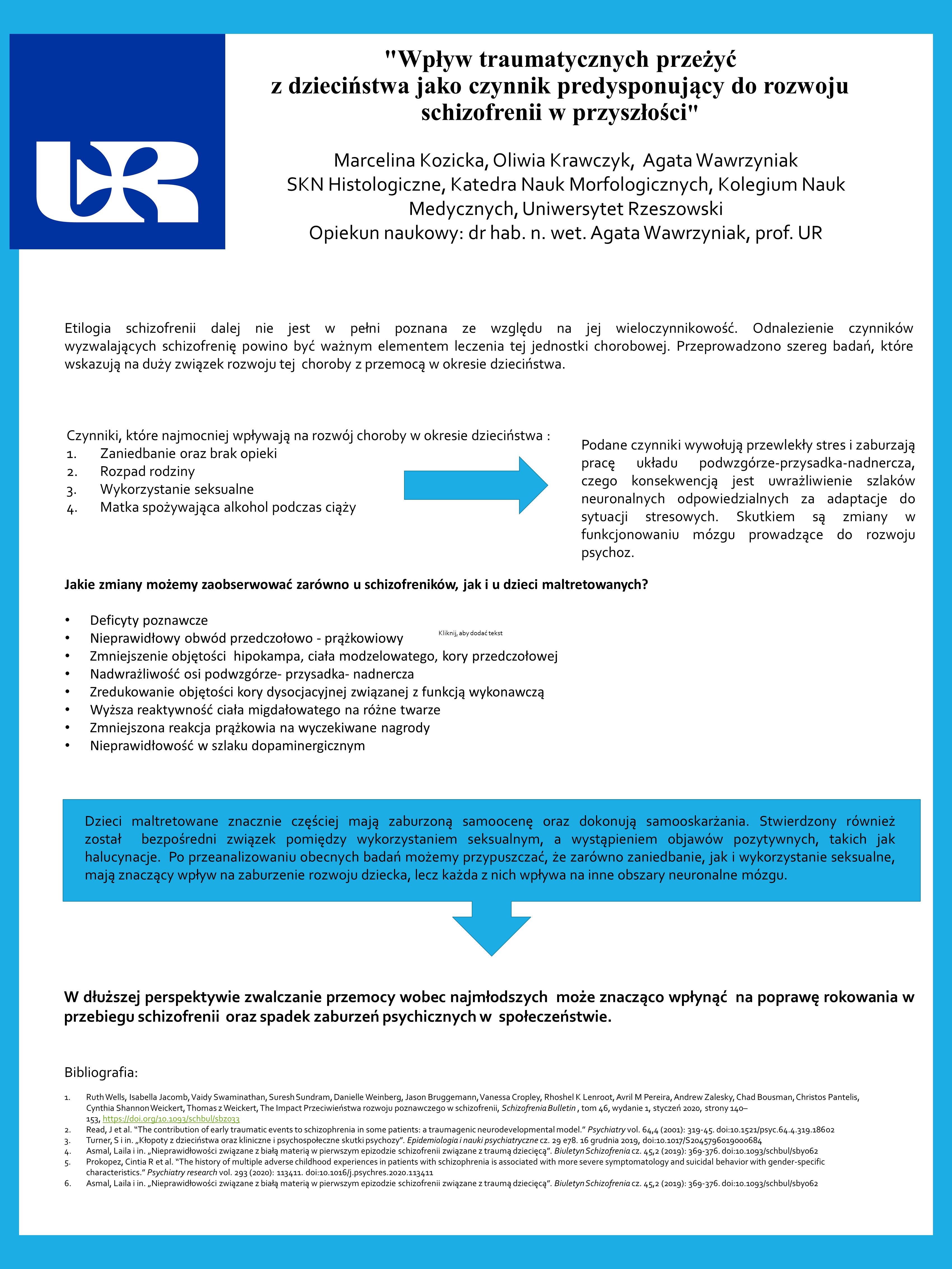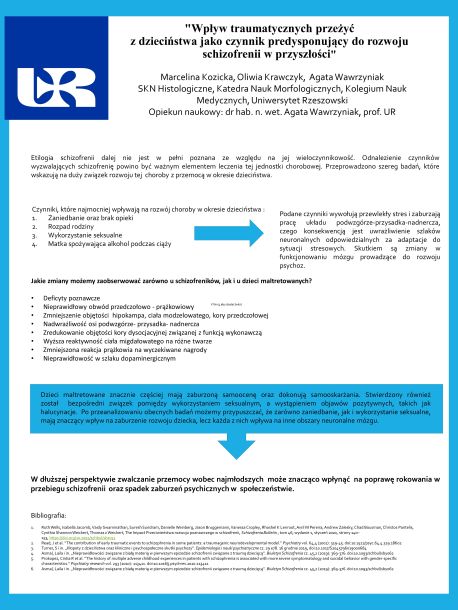 106. Marcelina Kozicka, Oliwia Krawczyk, Agata Wawrzyniak ''The influence of childhood traumatic experiences as a predisposing factor to the development of schizophrenia in the future"