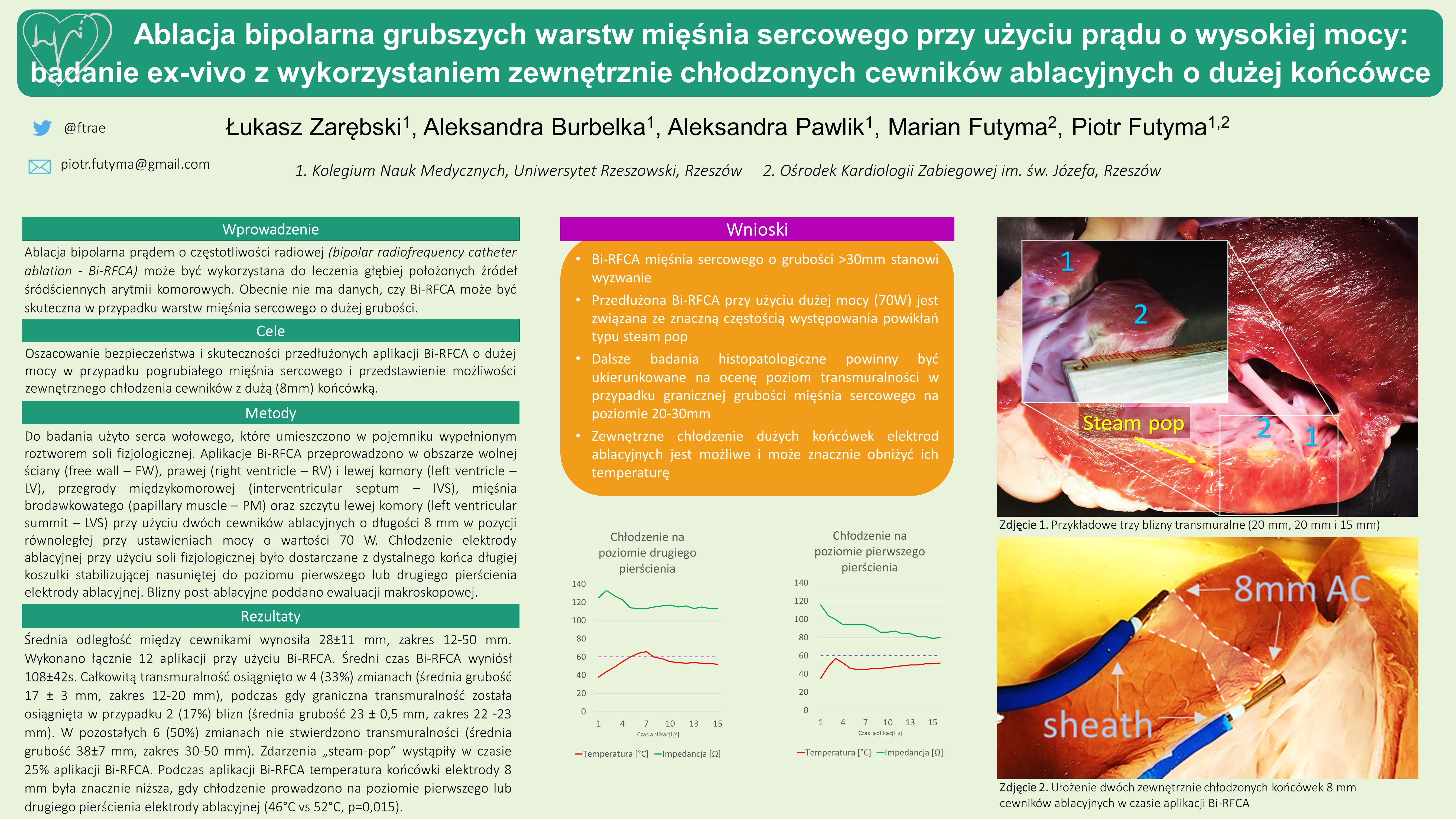44. Łukasz Zarębski, Aleksandra Burbelka, Aleksandra Pawlik, Marian Futyma, Piotr Futyma ''High-power current bipolar ablation of thicker layers of the heart muscle: ex-vivo study using large-tip externally cooled ablation catheters''