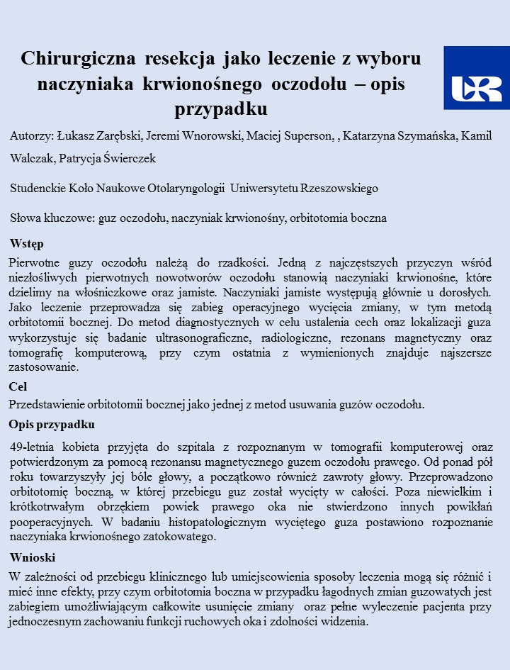 54. Łukasz Zarębski, Jeremi Wnorowski, Maciej Superson, Katarzyna Szymańska, Kamil Walczak, Patrycja Świerczek ''Surgical resection as a treatment of choice for orbital hemangioma - a case report''