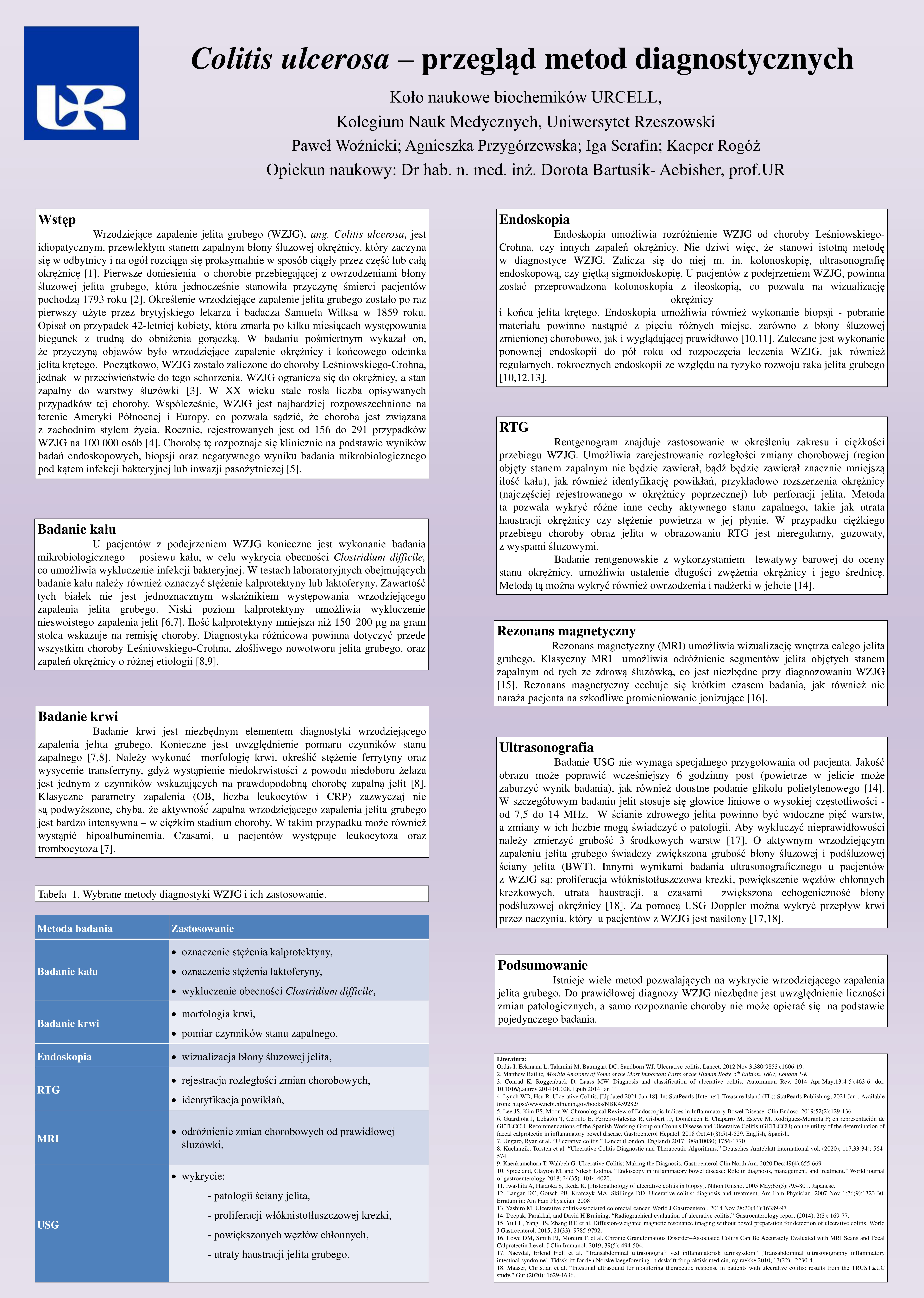 60. Paweł Woźnicki, Agnieszka Przygórzewska, Iga Serafin, Kacper Rogóż ''Colitis ulcerosa – przegląd metod diagnostycznych''