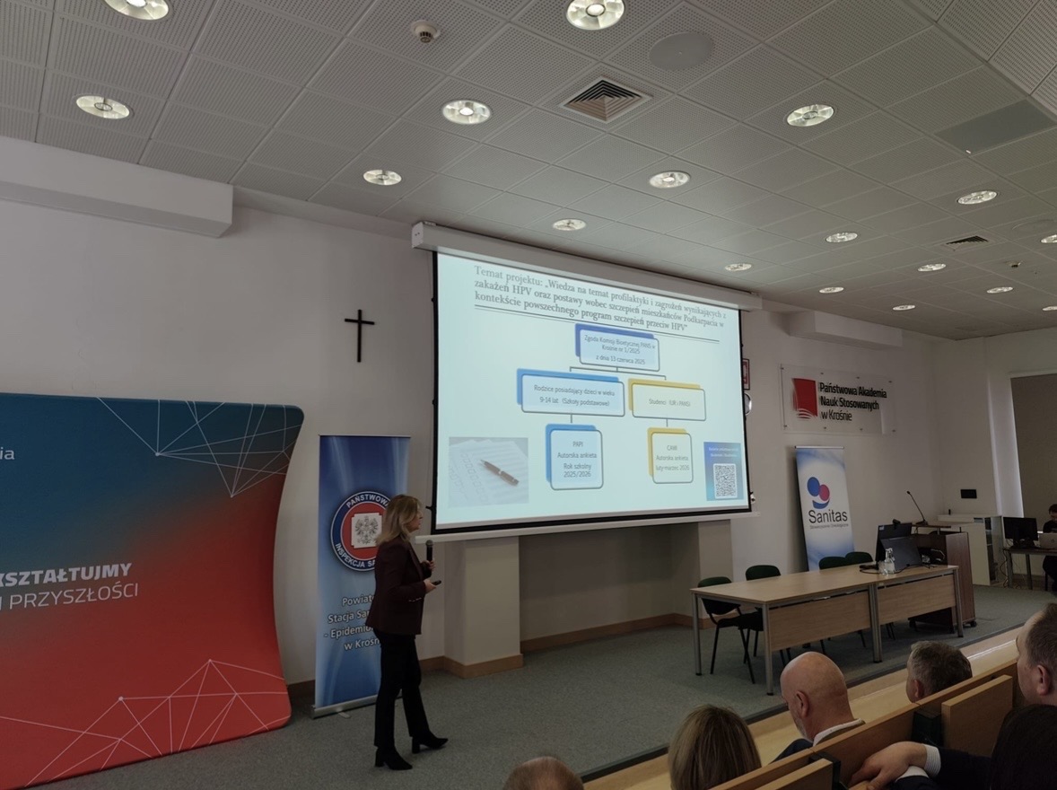 Dr Maria Zadarko-Domaradzka, kierownik Zakładu Promocji Zdrowia Wydziału Nauk o Kulturze Fizycznej Collegium Medicum Uniwersytetu Rzeszowskiego, reprezentując zespół badawczy z UR i PANS – wspólnie z prof. Emilianem Zadarko, dr Edytą Nizioł-Babiarz oraz prof. Zbigniewem Barabaszem – zaprezentowała wstępne wyniki badań dotyczących poziomu wiedzy oraz postaw studentów z wybranych podkarpackich uczelni wobec szczepień przeciwko HPV.
