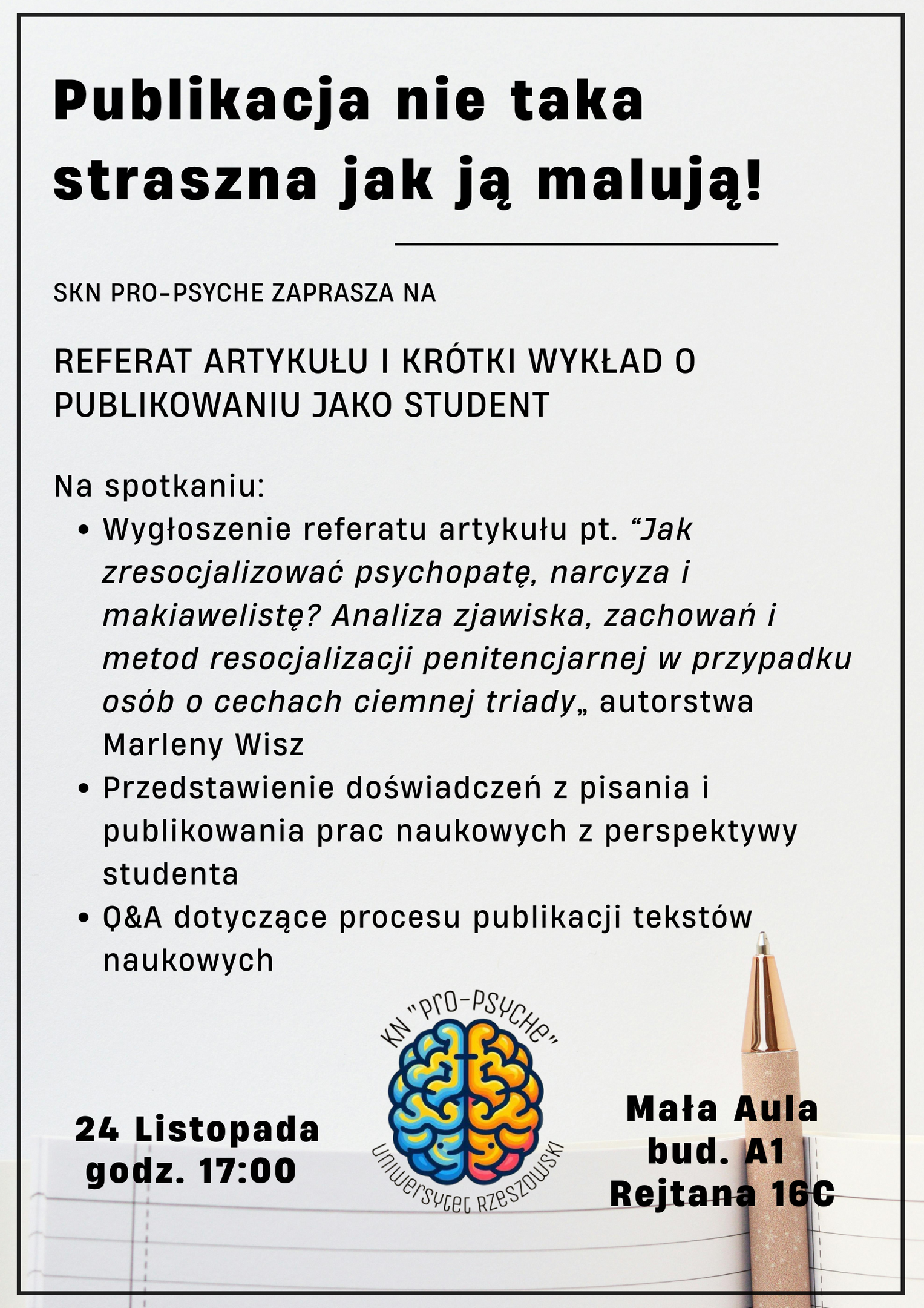 Zaproszenie na spotkanie SKN Pro-Psyche pt. "Publikacja nie taka straszna jak ją malują!" 24.11.2025 godz. 17.00