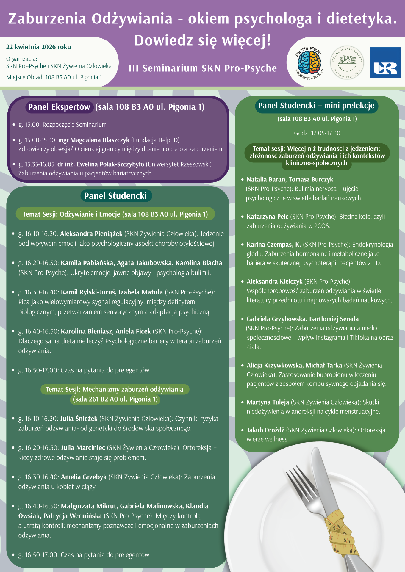Zaproszenie na spotkanie SKN Pro-Psyche pt. "Zaburzenia odżywiania okiem psychologa i dietetyka. Dowiedz się więcej!" 22.04.2026 godz. godz. 15.00, Miejsce obrad: 108 B3 A0, ul. Pigonia 1