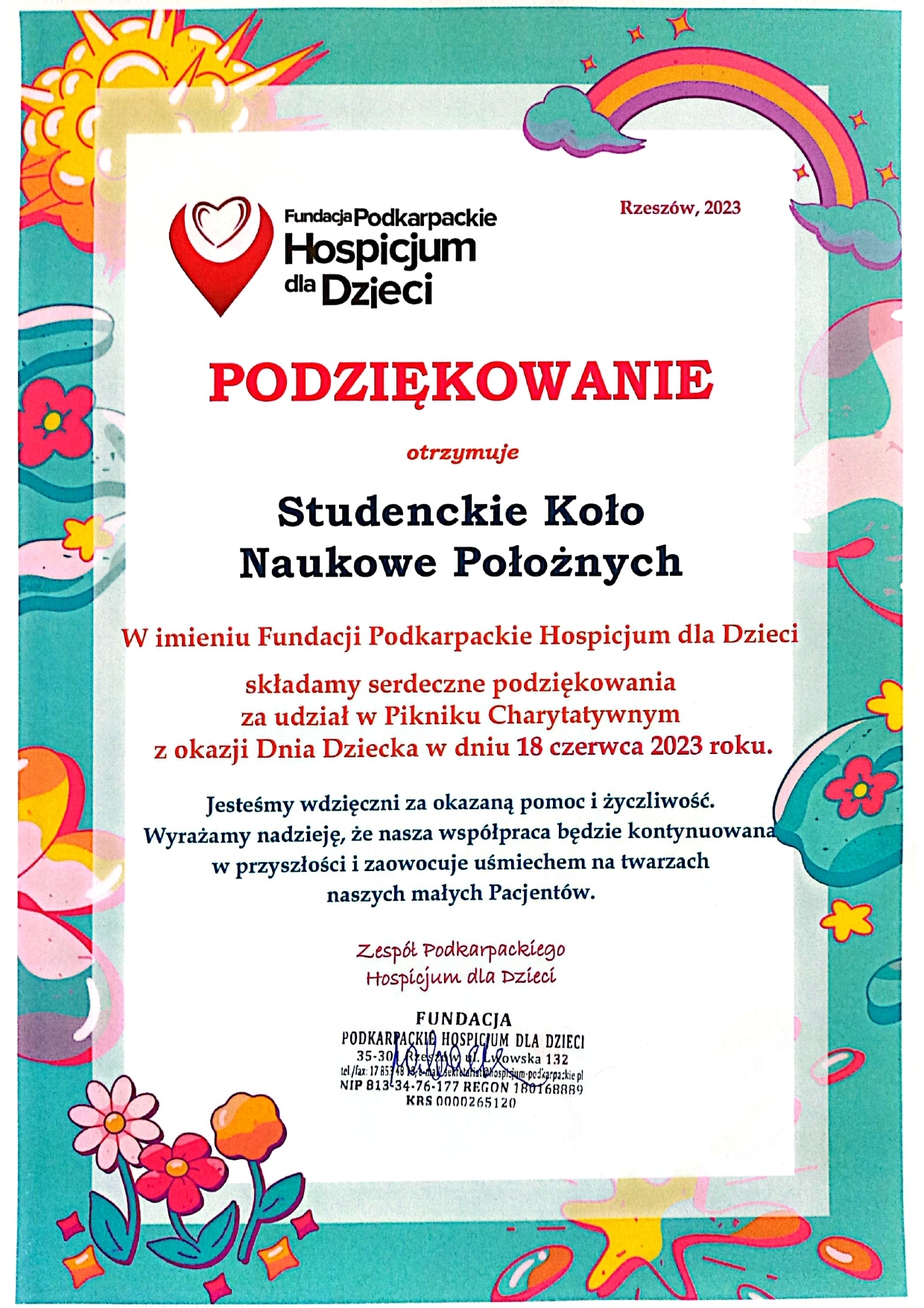 W dniu 18 czerwca 2023r. Studenckie Koła Naukowe Położnych w składzie: Katarzyna Kycińska, Julia Latra, Klaudia Buda i Weronika Czech już po raz drugi wzięło udział w Pikniku Charytatywnym z okazji Dnia Dziecka zorganizowanym w Fundacji Podkarpackie Hospicjum dla dzieci w Rzeszowie.