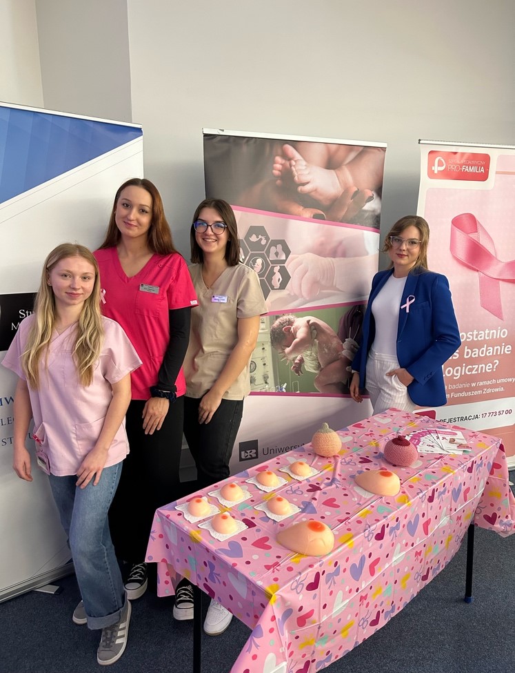 24 października 2024r. Studenckie Koło Naukowe Położnych w składzie: Wiktoria Biernat, Martyna Grys, Urszula Maczuga, Gabriela Sołga, wzięło udział w akcji profilaktycznej organizowanej przez SKN „Młoda Elektroradiologia” pod hasłem „Zawalcz o własne piersi”.