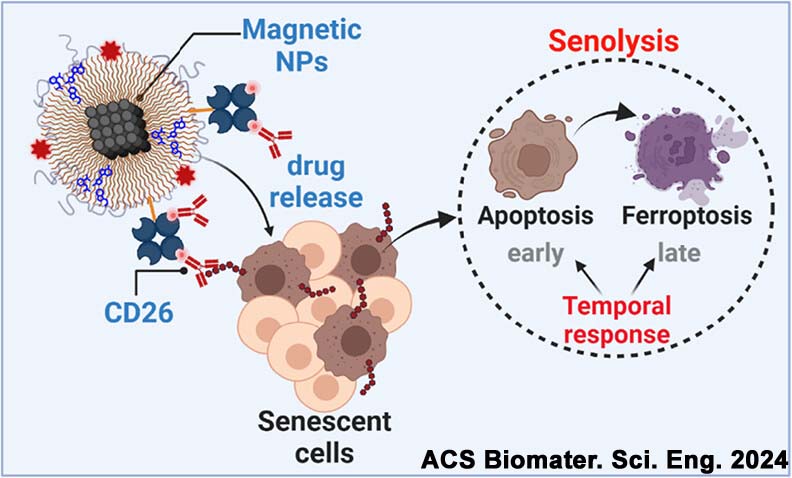 W artykule opisano metodę otrzymania funkcjonalizowanej magnetycznej nanoplatformy jako specyficznego nanonośnika inhibitora białek szoku cieplnego mającej zastosowanie w eliminowaniu komórek posiadających receptor błonowy CD26, w szczególności starych komórek skóry. W artykule wykazano, że opracowany nanosystem skutecznie indukuje śmierć komórkową starych komórek skóry poprzez aktywację apoptozy oraz ferroptozy.