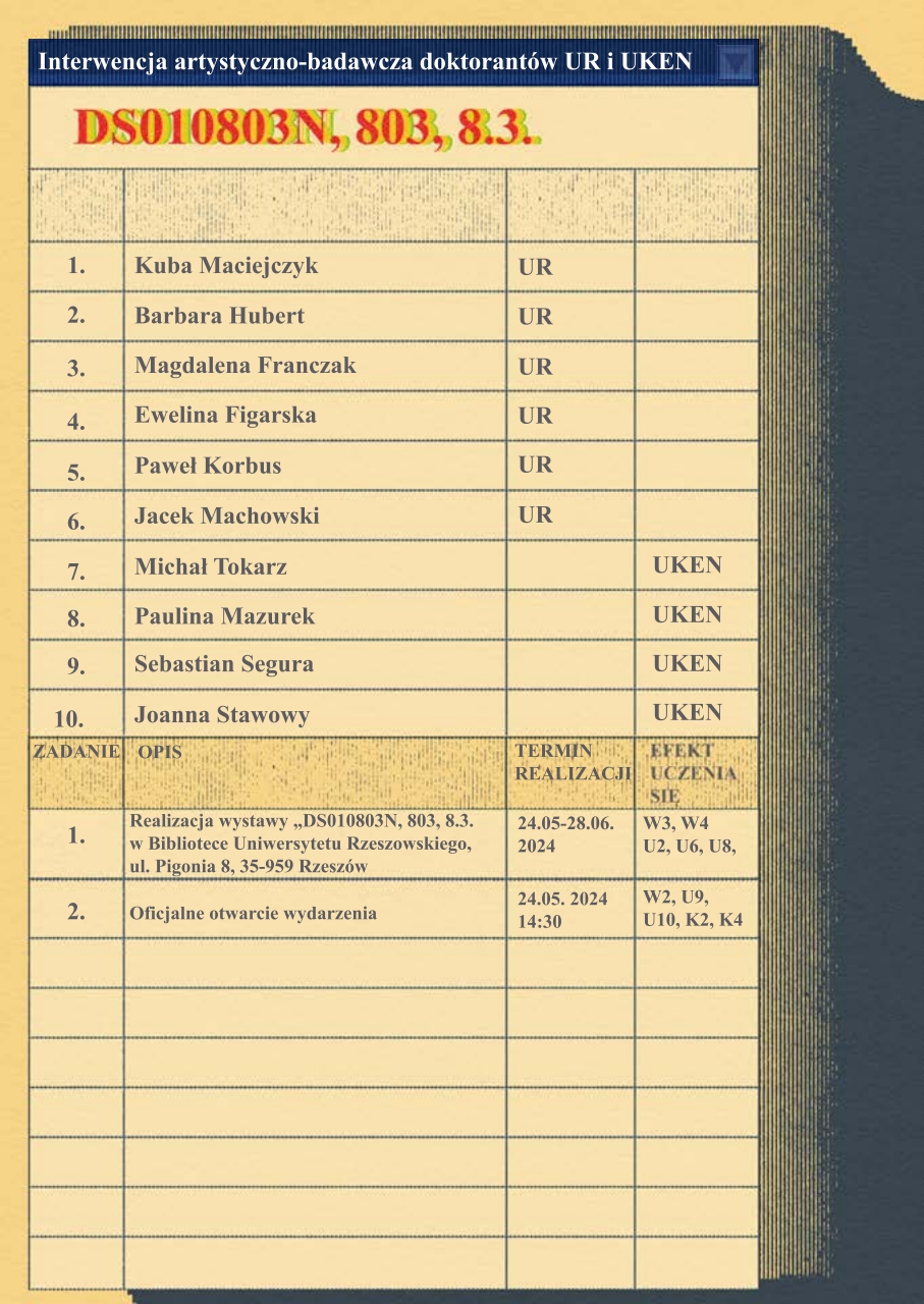 Wystawa jest odniesieniem doktorantów z Uniwersytetu Rzeszowskiego i Uniwersytetu Komisji Edukacji Narodowej w Krakowie do funkcjonowania w tym systemie oraz do pozycji artysty-badacza. Czy można w ogóle rozliczać się z realizacji procesu twórczego, czy da się go zaplanować, jak radzić sobie z procedurami?