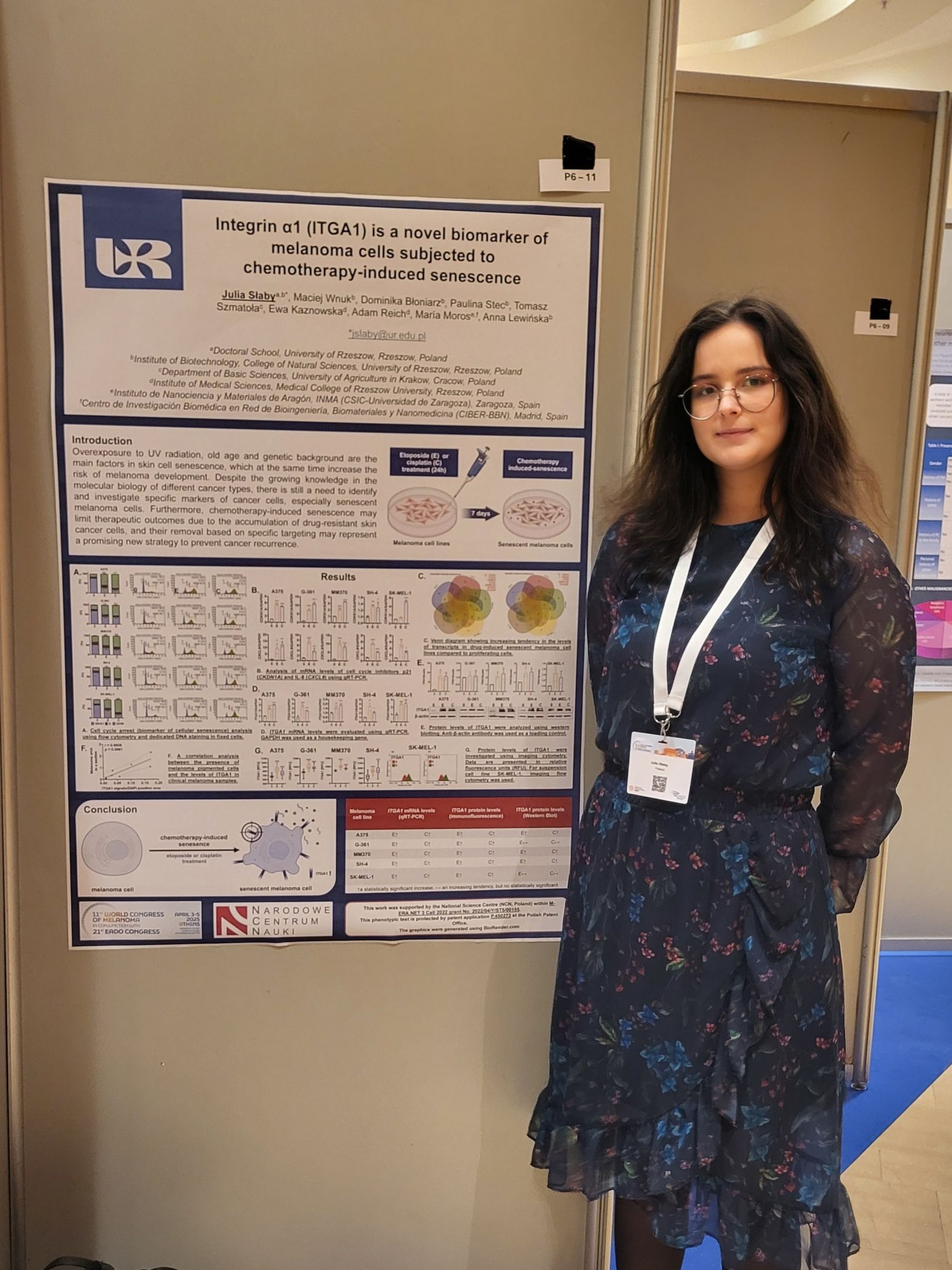 Pani Julia Słaby zaprezentowała plakat zatytułowany „Integrin α1 (ITGA1) is a novel biomarker of melanoma cells subjected to chemotherapy-induced senescence”, w którym przedstawiła wyniki uzyskane podczas swoich badań doktorskich. W prezentacji zawarto najnowsze odkrycie grupy badawczej pod kierunkiem dr hab. Anny Lewińskiej, prof UR oraz dr. Marii Moros (Instituto de Nanociencia y Materiales de Aragón, INMA, CSIC-Universidad de Zaragoza), które opisuje rolę markera integryny 1α w diagnostyce oraz detekcji starzejących się i opornych na leczenie komórek czerniaka. Wyniki te ukazują obiecujące podejście do terapii mających na celu eliminację tych trudnych do leczenia komórek. Prezentowane badania były finansowane z grantu pt. „Senolityczna nanoplatforma do identyfikacji i eliminowania komórek Zombie nowotworów skóry” (nr DEC-2022/04/Y/ST5/00155, Narodowe Centrum Nauki) w ramach programu M-ERA.NET. Badania były prowadzone we współpracy z prof. dr hab. Ewą Kaznowską oraz prof. dr hab. Adamem Reichem z Wydziału Medycznego Collegium Medicum UR.