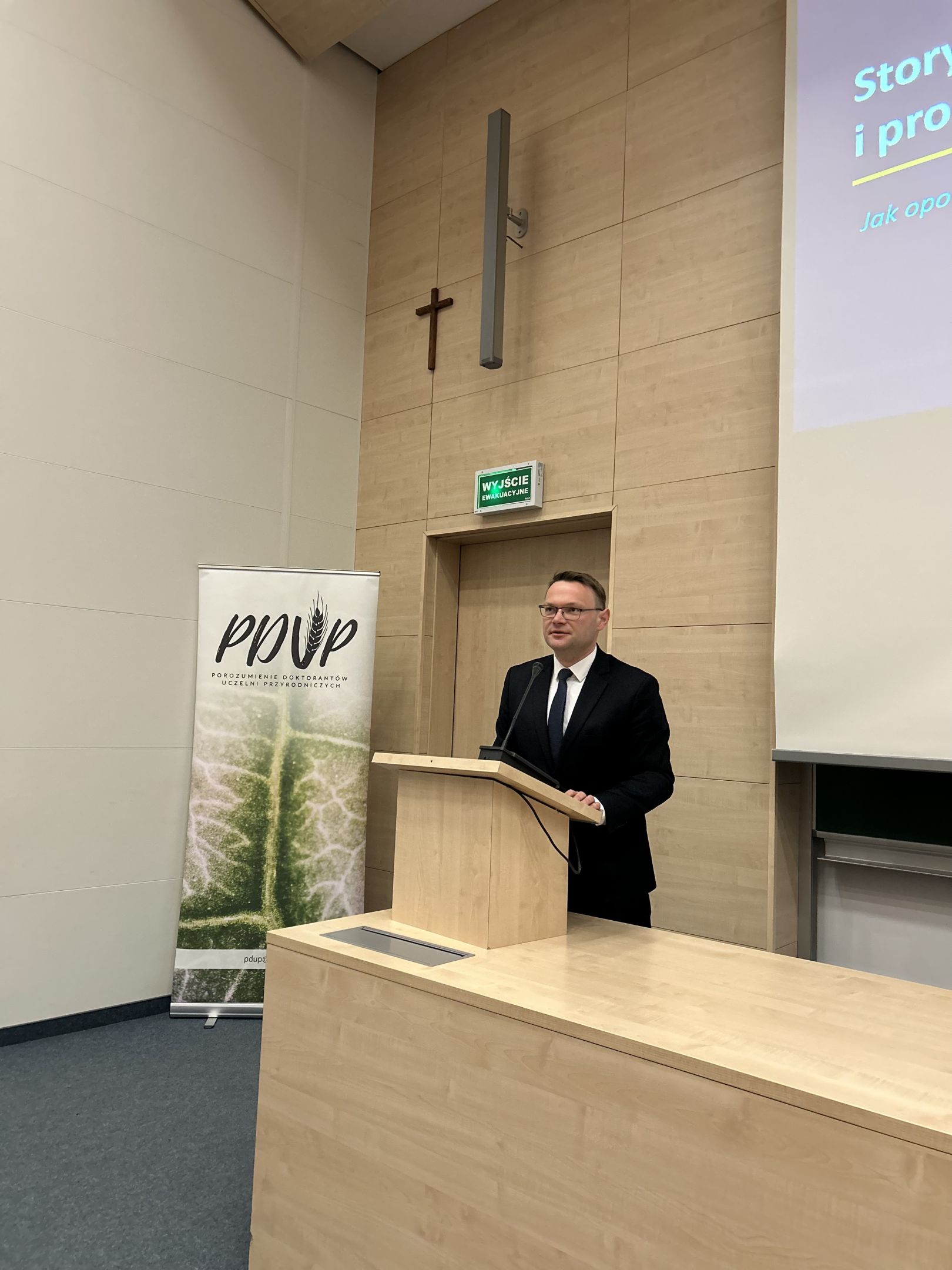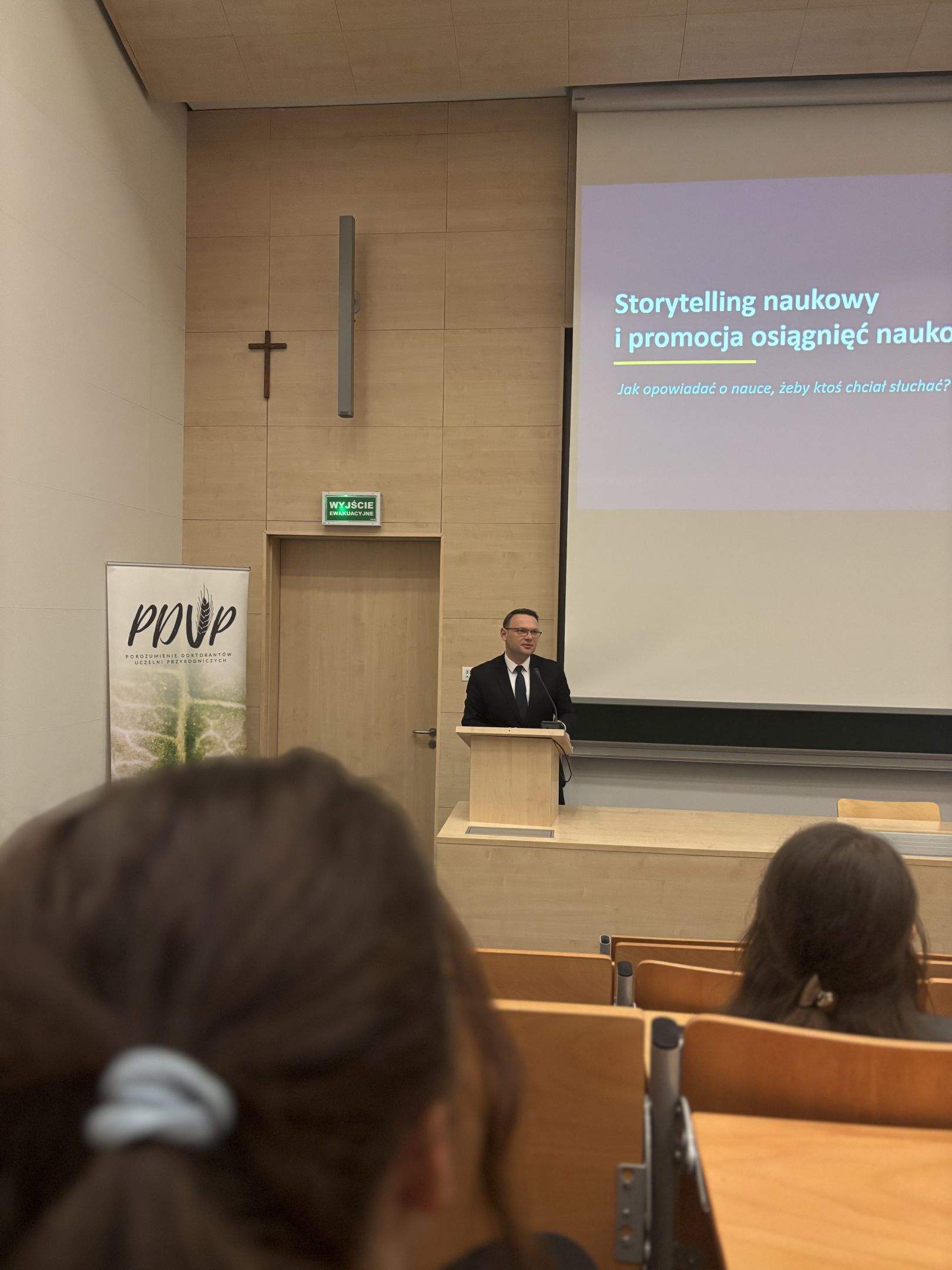 Szczególnym punktem programu był wykład specjalny pt. „Storytelling naukowy i promocja osiągnięć naukowych. Jak opowiadać o nauce, żeby ktoś chciał słuchać?”, wygłoszony przez dr. Jarosława Kinala – eksperta w zakresie komunikacji społecznej i mediów. Wystąpienie to podkreśliło znaczenie efektywnego przekazu naukowego oraz roli popularyzacji badań w budowaniu relacji między nauką a społeczeństwem.