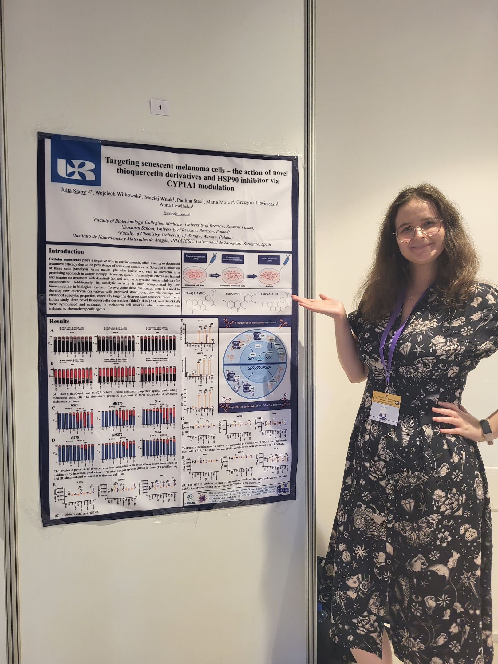 Pani Julia Słaby zaprezentowała plakat zatytułowany Targeting senescent melanoma cells – the action of novel thioquercetin derivatives and HSP90 inhibitor via CYP1A1 modulation, w którym przedstawiła swoje wyniki uzyskane podczas badań do rozprawy doktorskiej. W pracy tej pokazała aktywność senolityczną oraz wpływ nowo zsyntetyzowanych pochodnych kwercetyny w połączeniu z inhibitorem białka szoku cieplnego HSP90 na proces detoksykacji w starzejących się komórkach czerniaka in vitro. Badane związki uwrażliwiały komórki nowotworowe na apoptotyczną śmierć komórkową, stanowiąc tym samym potencjalne podejście w terapiach nowotworowych.