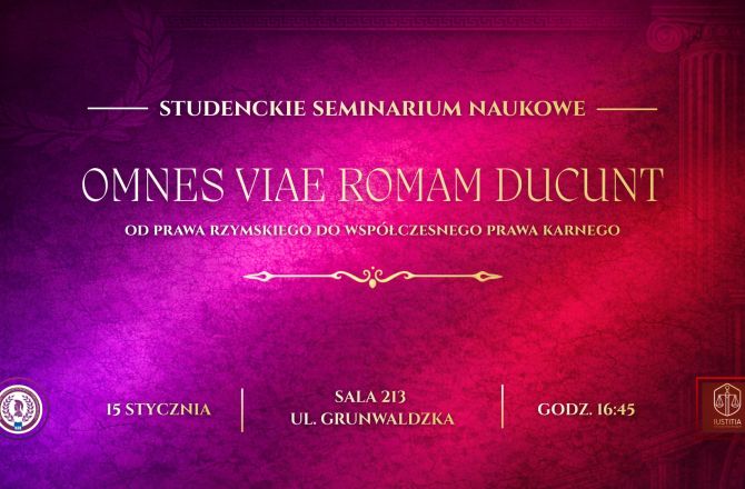 Koło Naukowe Prawa Rzymskiego i Porównawczego IUS ROMANORUM oraz Koło Naukowe Prawa Karnego "Iustitia" zapraszają do udziału w Studenckim Seminarium Naukowym pt. "Omnes viae Romam ducunt: od prawa rzymskiego do współczesnego prawa karnego", które odbędzie się 15.01.2026 r. o godz. 16:45 w s. 213 w budynku WPA przy ul. Grunwaldzkiej 13.
