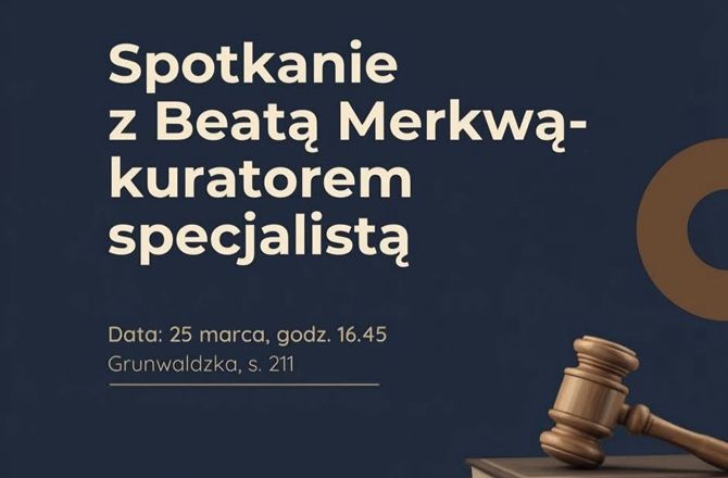 Koło Naukowe Postępowania Karnego i Prawa Karnego Wykonawczego ''Temida'' zaprasza na spotkanie z kuratorem sądowym Panią Beatą Merkwą, które odbędzie się 25.03.2026 r. o godz. 16:45 w s. 211 w budynku WPA przy ul. Grunwaldzkiej 13.