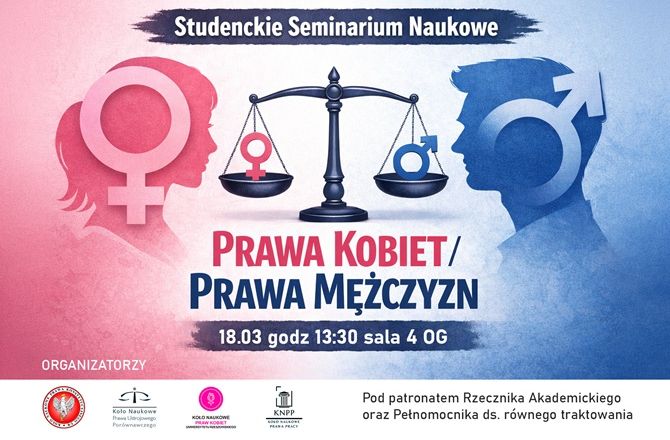 Koło Naukowe Prawa Konstytucyjnego „Constitutio”, Prawa Ustrojowego Porównawczego, Prawa Pracy oraz Praw Kobiet zapraszają do udziału w Studenckim Seminarium Naukowym: prawa kobiet/prawa mężczyzn, które odbędzie się 18.03.2026 r. o godz. 13:30 w sali nr 4 w budynku WPA przy Pl. Ofiar Getta 4-5.