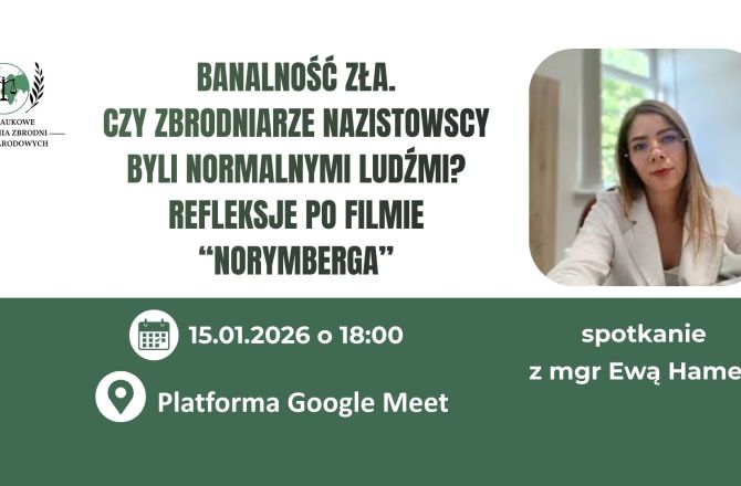 Koło Naukowe ds. Badania Zbrodni Międzynarodowych zaprasza do udziały w prelekcji "Banalność zła. Czy zbrodniarze nazistowscy byli normalnymi ludźmi? Refleksje po filmie "Norymberga", które odbędzie się 15.01.2026 r. o godz. 18:00 za pośrednictwem platformy Google Meet.