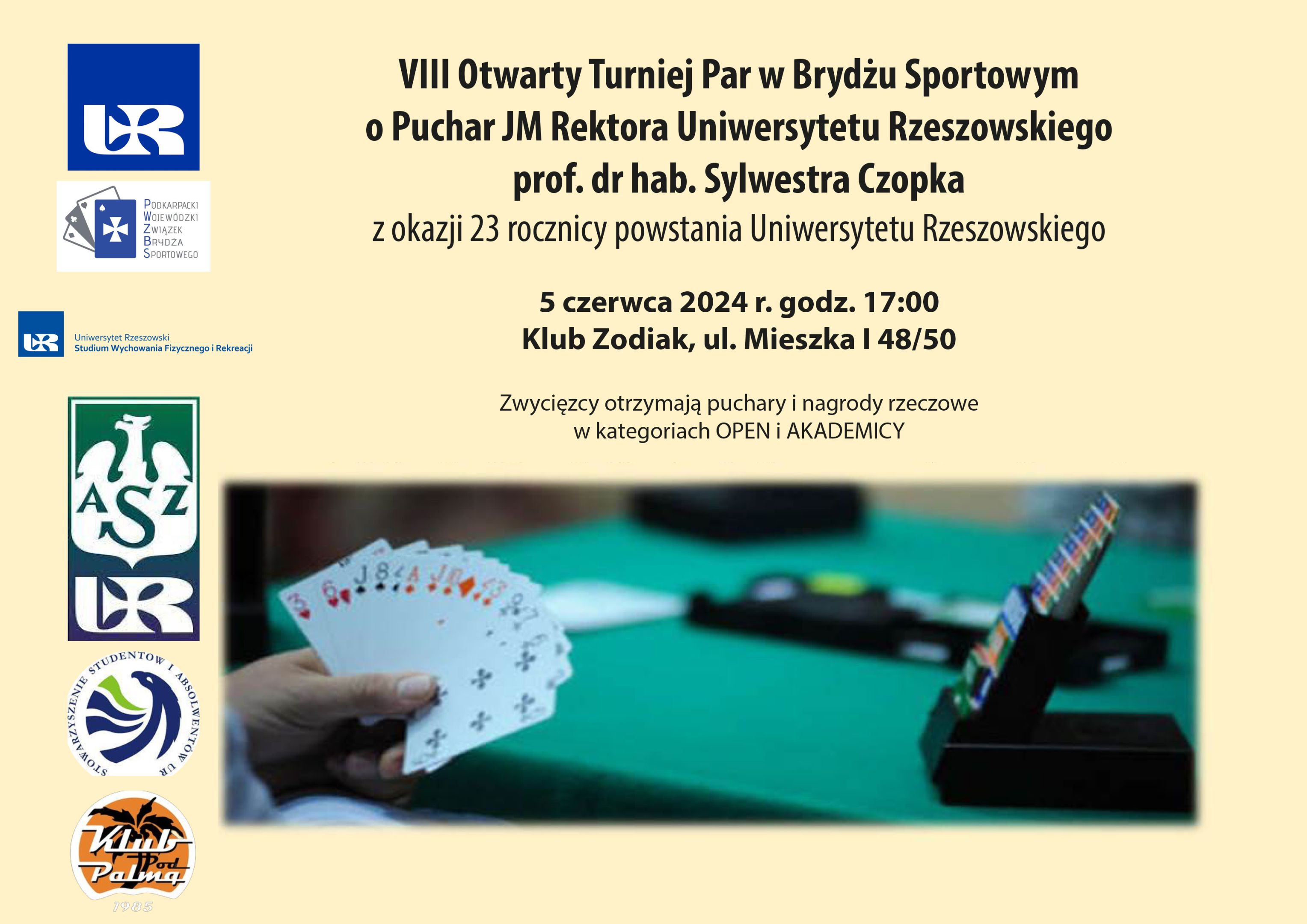 Turniej odbędzie się w dniu 05.06.2024 r. o godz. 17.00 z okazji 23-ej rocznicy powstania Uniwersytetu Rzeszowskiego przy współudziale Zarządu Podkarpackiego Wojewódzkiego Związku Brydża Sportowego w sali konferencyjnej Zodiak przy ul. Mieszka I 48/50.