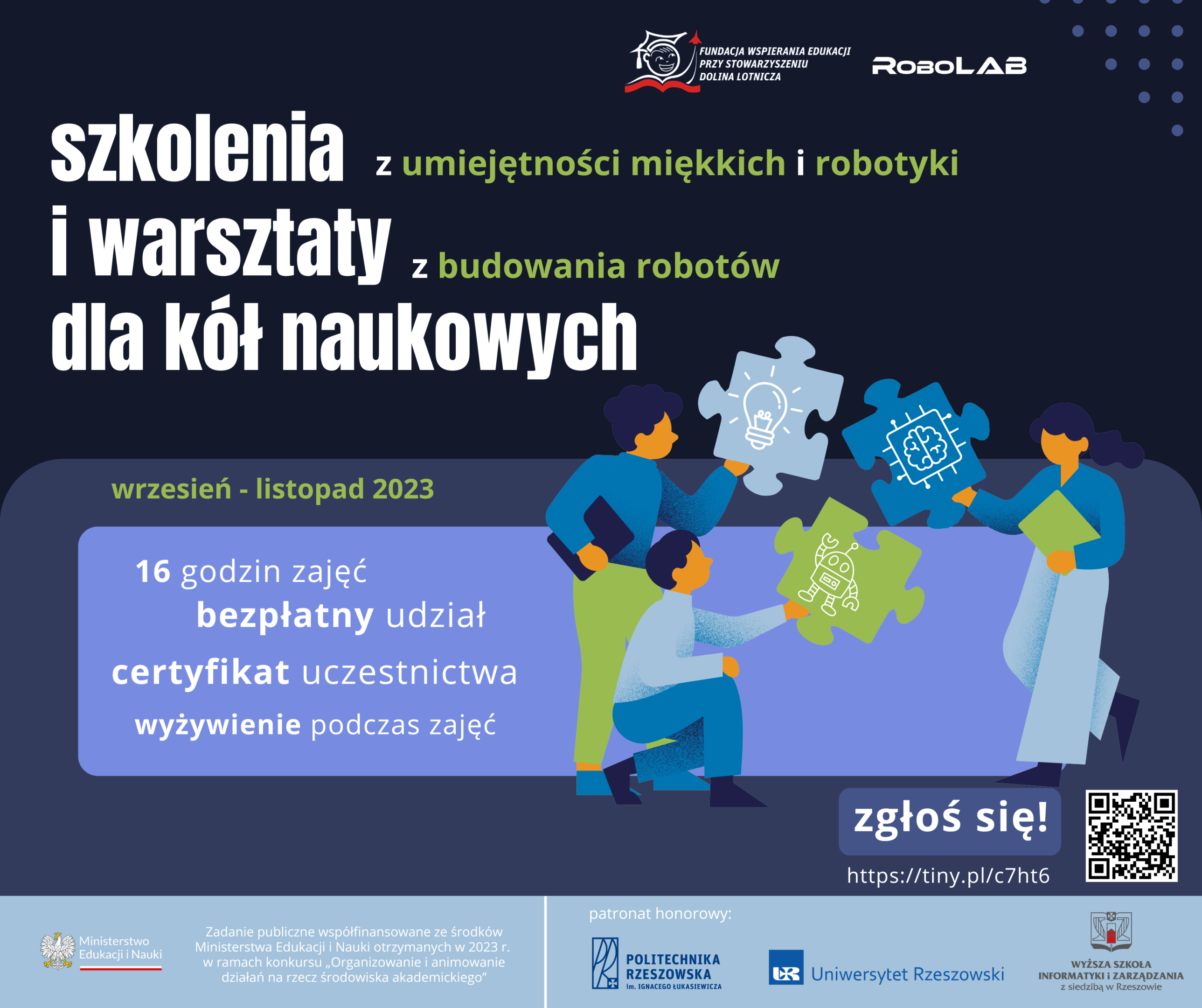 Fundacja Wspierania Edukacji przy Stowarzyszeniu Dolina Lotnicza zaprasza studentów rzeszowskich uczelni wyższych do wzięcia udziału w całkowicie bezpłatnych szkoleniach z umiejętności miękkich i wiedzy specjalistycznej z robotyki oraz warsztatach robotycznych. Zajęcia realizowane są w ramach zadania publicznego “Szkolenia i warsztaty dla studenckich kół naukowych” przy współpracy projektu RoboLAB, który wspiera rozwój młodych osób w zwiększeniu kompetencji STEM i kluczowych umiejętności miękkich.