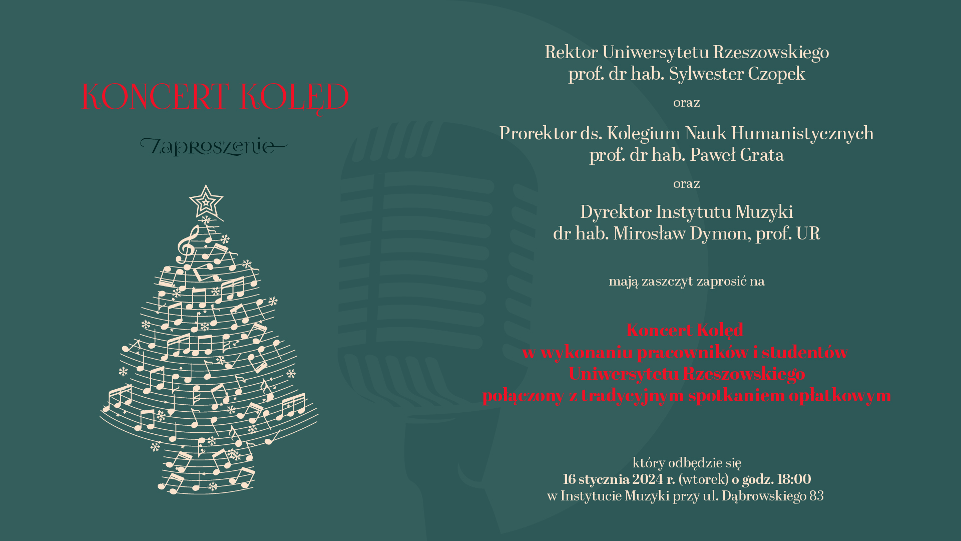 Rektor Uniwersytetu Rzeszowskiego prof. dr hab. Sylwester Czopek, Prorektor ds. Kolegium Nauk Humanistycznych prof. dr hab. Paweł Grata oraz Dyrektor Instytutu Muzyki dr hab. Mirosław Dymon, prof. UR mają zaszczyt zaprosić na Koncert Kolęd w wykonaniu pracowników i studentów Uniwersytetu Rzeszowskiego połączony z tradycyjnym spotkaniem opłatkowym.