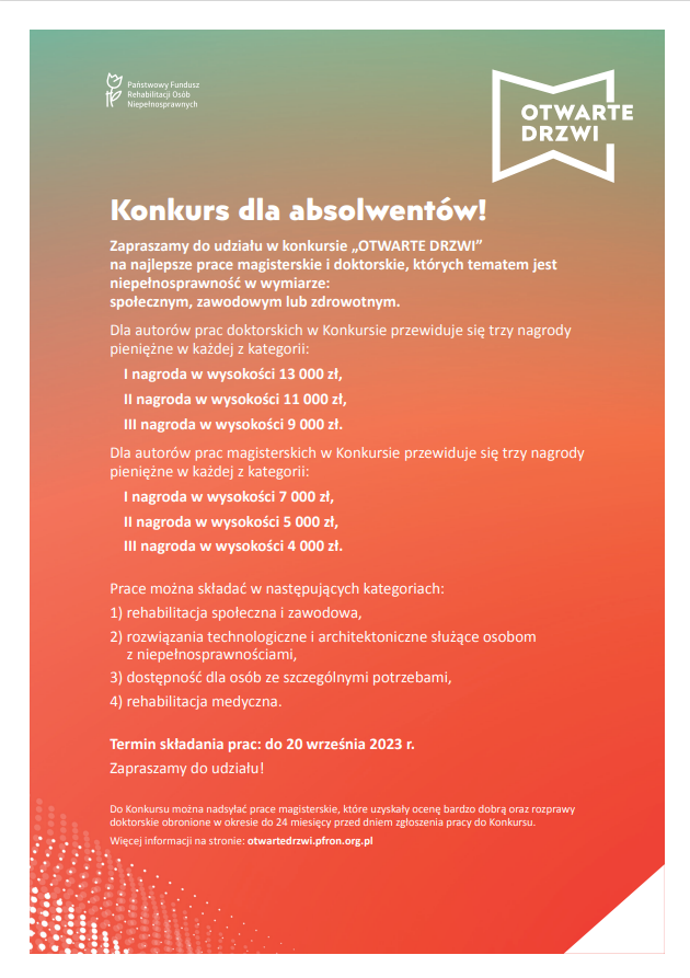 Serdecznie zapraszamy do wzięcia udziału w Ogólnopolskim Konkursie "Otwarte Drzwi" na najlepsze prace magisterskie i doktorskie, których tematem jest niepełnosprawność w wymiarze: społecznym, zawodowym lub zdrowotnym organizowanym przez Państwowy Fundusz Rehabilitacji Osób Niepełnosprawnych.