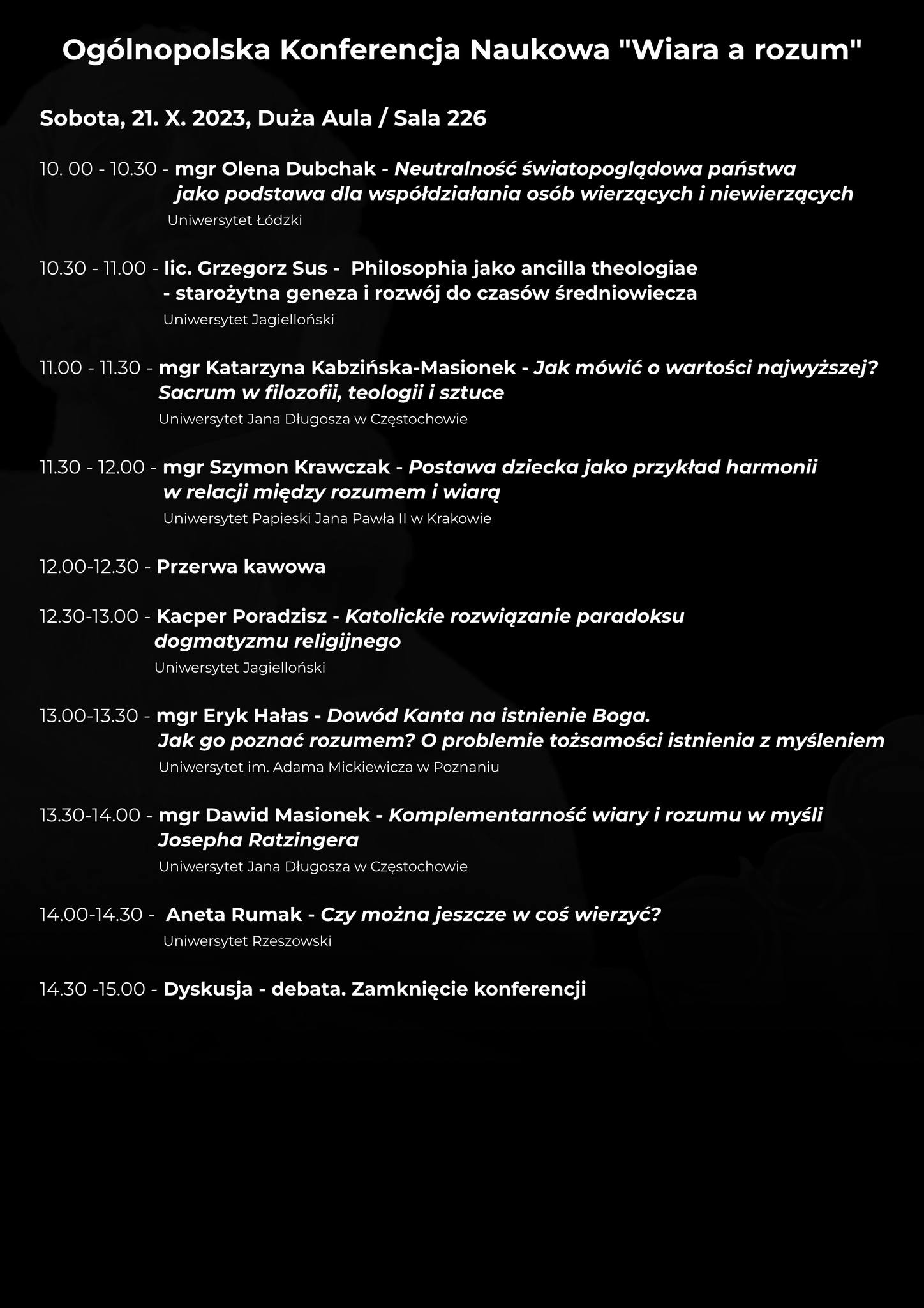 W ramach zjazdu odbywać się będzie konferencja naukowa pod hasłem „Wiara a rozum”. Studenci filozofii, ich mistrzowie, zaproszeni goście, prelegenci oraz wszyscy zainteresowani podejmą rozważania w zakresie zagadnień: relacja między wiarą a rozumem w różnych epokach i kulturach, filozofia a odpowiedzi na pytania w kwestiach wiary, jak przebiegają współczesne debaty na temat zgodności nauki z religią, zgodność/niezgodność krytycznego myślenia z wiarą, wpływ relacji wiara a rozum na podejmowanie decyzji moralnych, wpływ kultury i edukacji na stosunek do wiary i rozumu, możliwość opisania za pomocą rozumu doświadczenia religijnego. Z pewnością nie zabraknie rozważań nad statusem filozofii czy nad jej społeczną rolą. Spotkanie członków filozoficznych kół naukowych, które również odbędzie się w ramach zjazdu, skupi się, między innymi, na rozważaniu istotnego problemu: czy filozof ma bądź powinien mieć jakąś misję?
