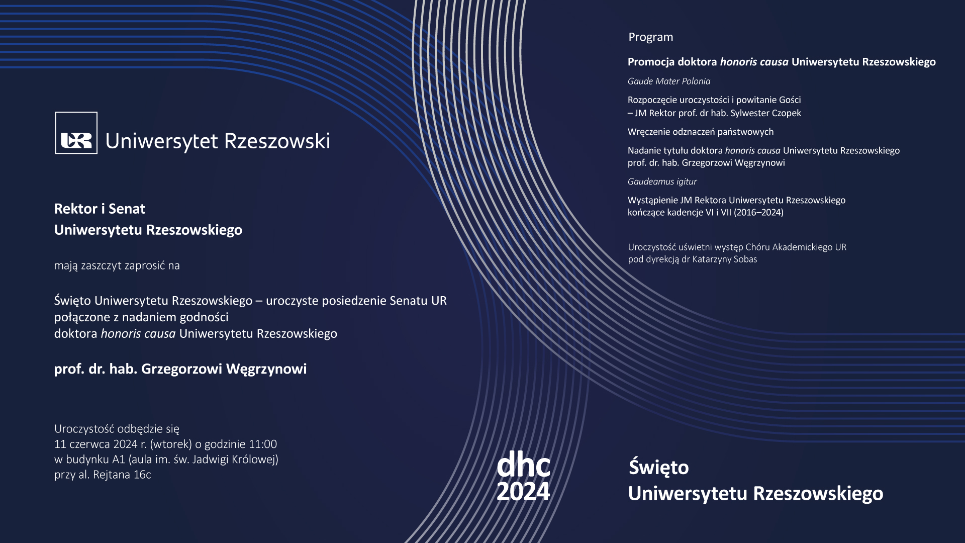 Święto Uniwersytetu Rzeszowskiego - uroczyste posiedzenie Senatu UR połączone z nadaniem godności doktora honoris causa Uniwersytetu Rzeszowskiego prof. dr. hab. Grzegorzowi Węgrzynowi odbędzie się 11 czerwca, o godz. 11 w budynku A1 (aula im. Jadwigi Królowej) przy al. Rejtana 16c