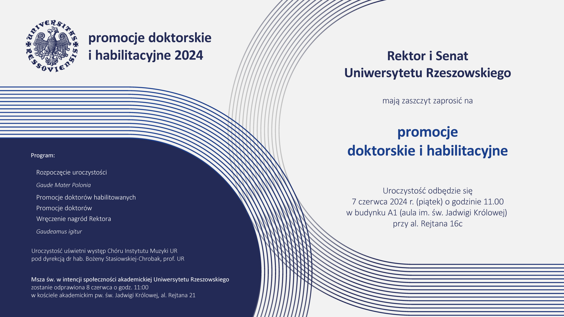 Uroczystość odbędzie się 7 czerwca 2024 r. (piątek) o godzinie 11:00 w budynku A1 (aula. im. św. Jadwigi Królowej) przy al. Rejtana 16c