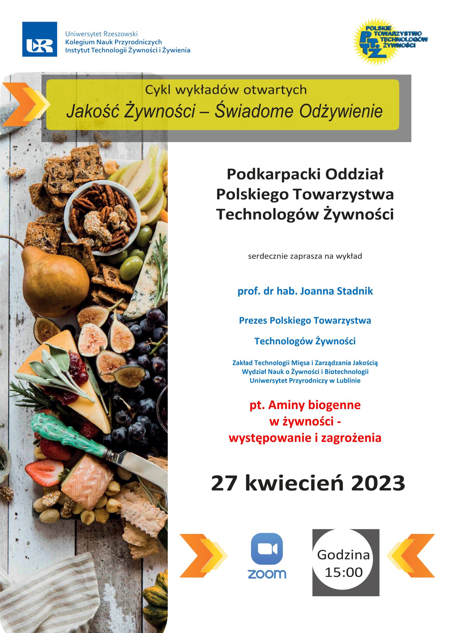 Serdecznie zapraszamy na kolejny wykład w ramach cyklu wykładów otwartych„Jakość żywności - świadome odżywianie” organizowanych przez PO PTTŻ w dniu 27.04.2023 (czwartek) o godz. 15.00 na platformie ZOOM.