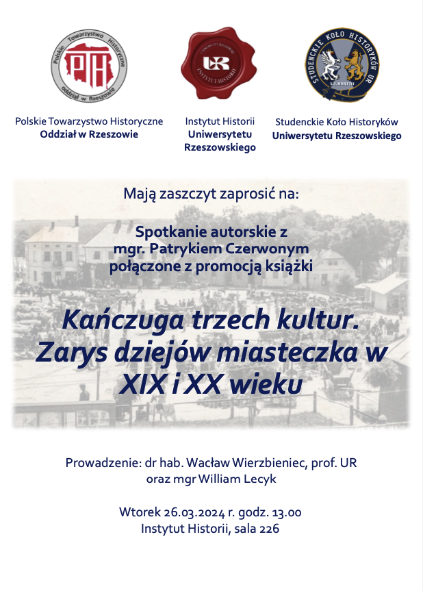 Studenckie Koło Historyków UR zaprasza na spotkanie autorskie z Patrykiem Czerwonym, absolwentem UR i autorem monografii  pt. "Kańczuga trzech kultur. Zarys dziejów miasteczka w XIX i XX wieku"