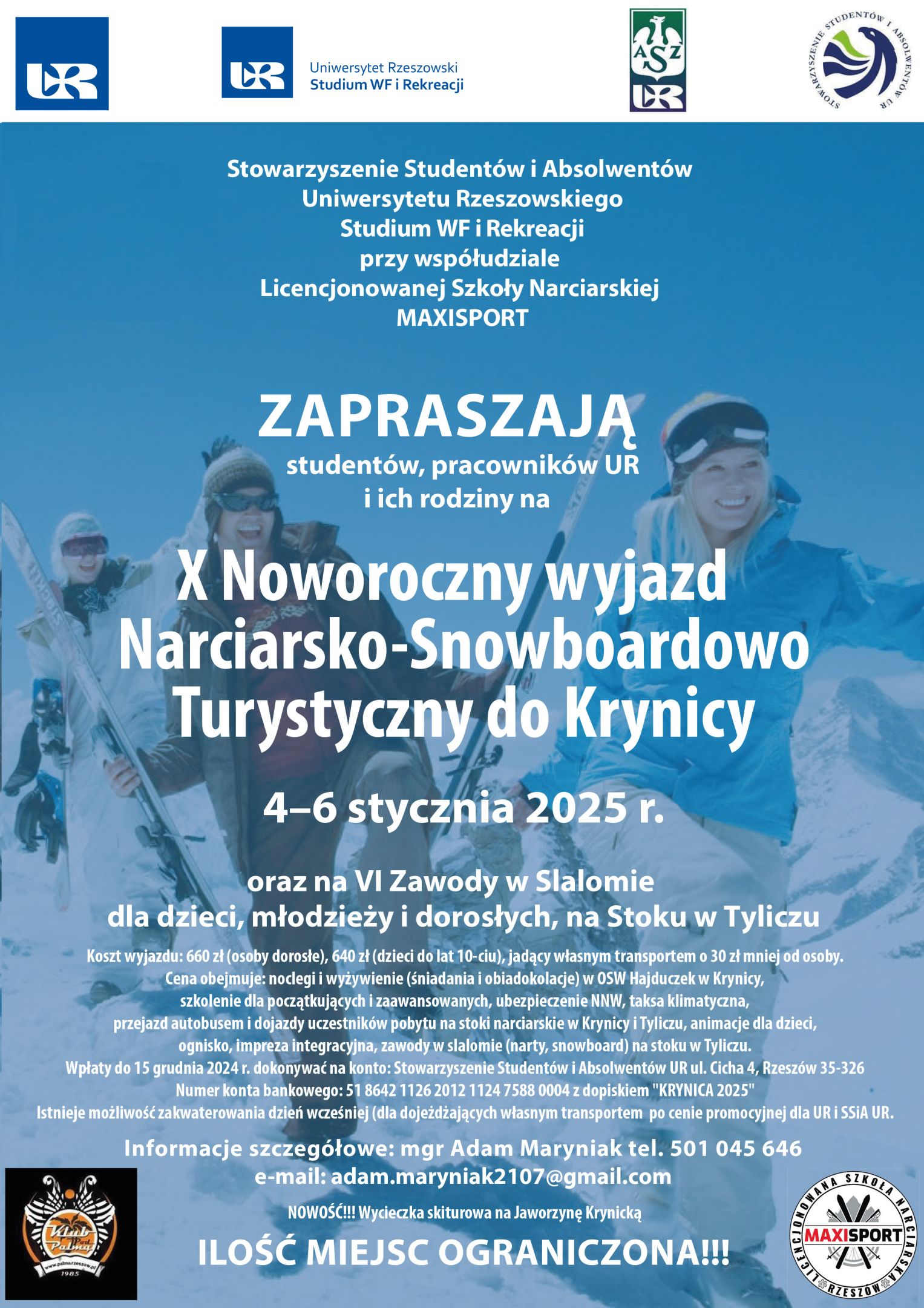 Stowarzyszenie Studentów i Absolwentów Uniwersytetu Rzeszowskiego zaprasza na X Jubileuszowy wyjazd Noworoczny Narciarsko-Snowboardowy, Turystyczny i Wypoczynkowy pracowników Uniwersytetu Rzeszowskiego i ich rodziny oraz sympatyków Stowarzyszenia Studentów i Absolwentów UR do Krynicy i Tylicza w dniach 4-6 stycznia 2025 r.