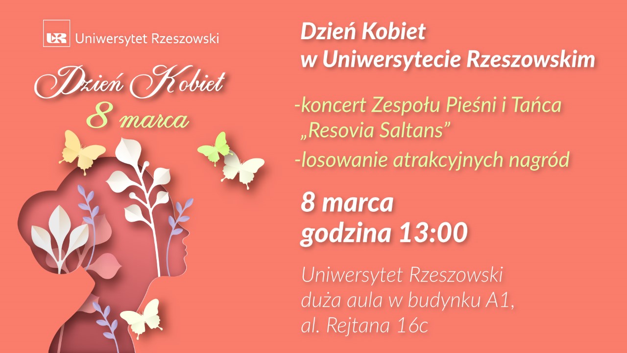 Zapraszamy wszystkie Panie studiujące i pracujące w Uniwersytecie Rzeszowskim.  W programie Koncert Zespołu Pieśni i Tańca Resovia Saltans, a po koncercie losowanie kobiecych upominków.