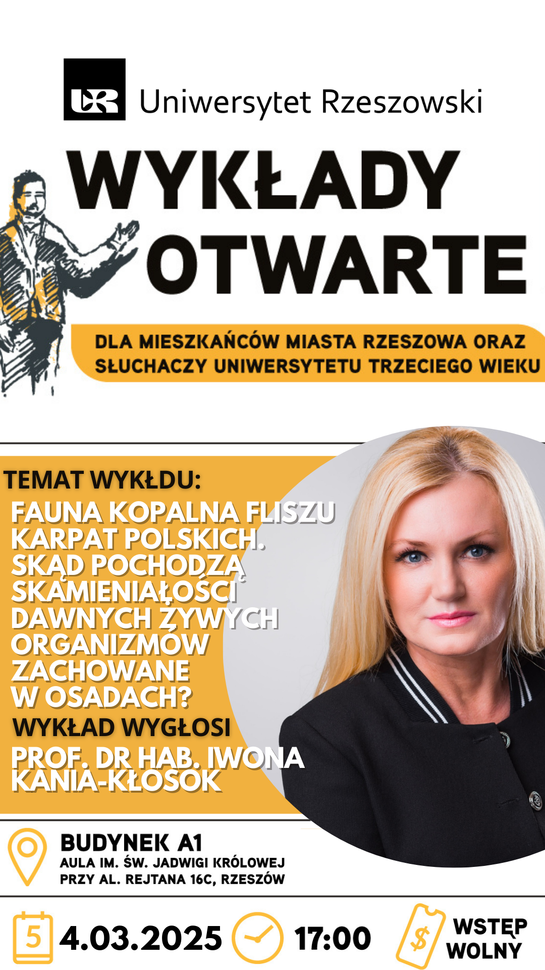 4 marca o godz. 17:00 w bud. A1 al. Rejtana 16c, w Dużej Auli odbędzie się wykład otwarty pt. Fauna kopalna fliszu Karpat polskich. Skąd pochodzą skamieniałości dawnych żywych organizmów zachowane w osadach? prof. dr hab. Iwony Kani-Kłosok z Wydziału Biologii i Ochrony Przyrody.