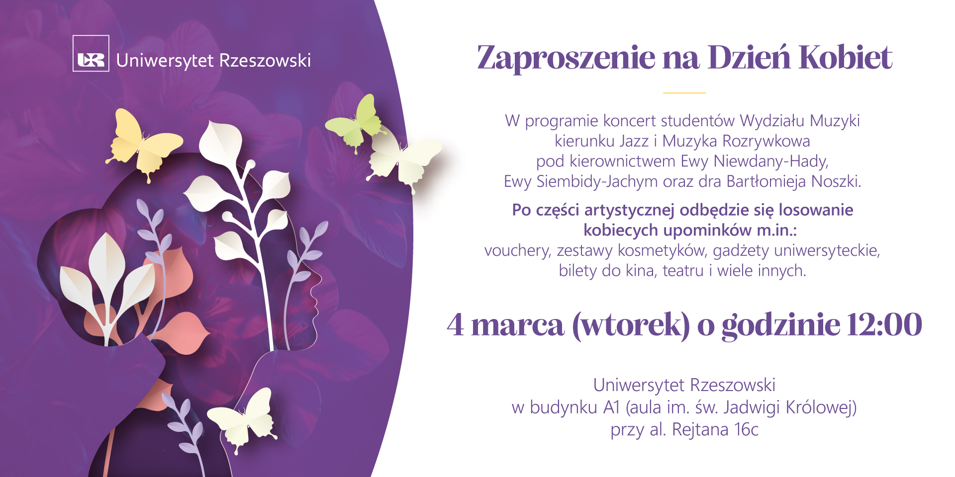 JM Rektor Uniwersytetu Rzeszowskiego ma zaszczyt zaprosić wszystkie Panie studiujące i pracujące w Uniwersytecie Rzeszowskim na Uniwersytecki Dzień Kobiet. Uroczystość odbędzie się 4 marca (tj. wtorek) o godzinie 12:00, w budynku A1 (aula im. św. Jadwigi Królowej) przy al. Rejtana 16c