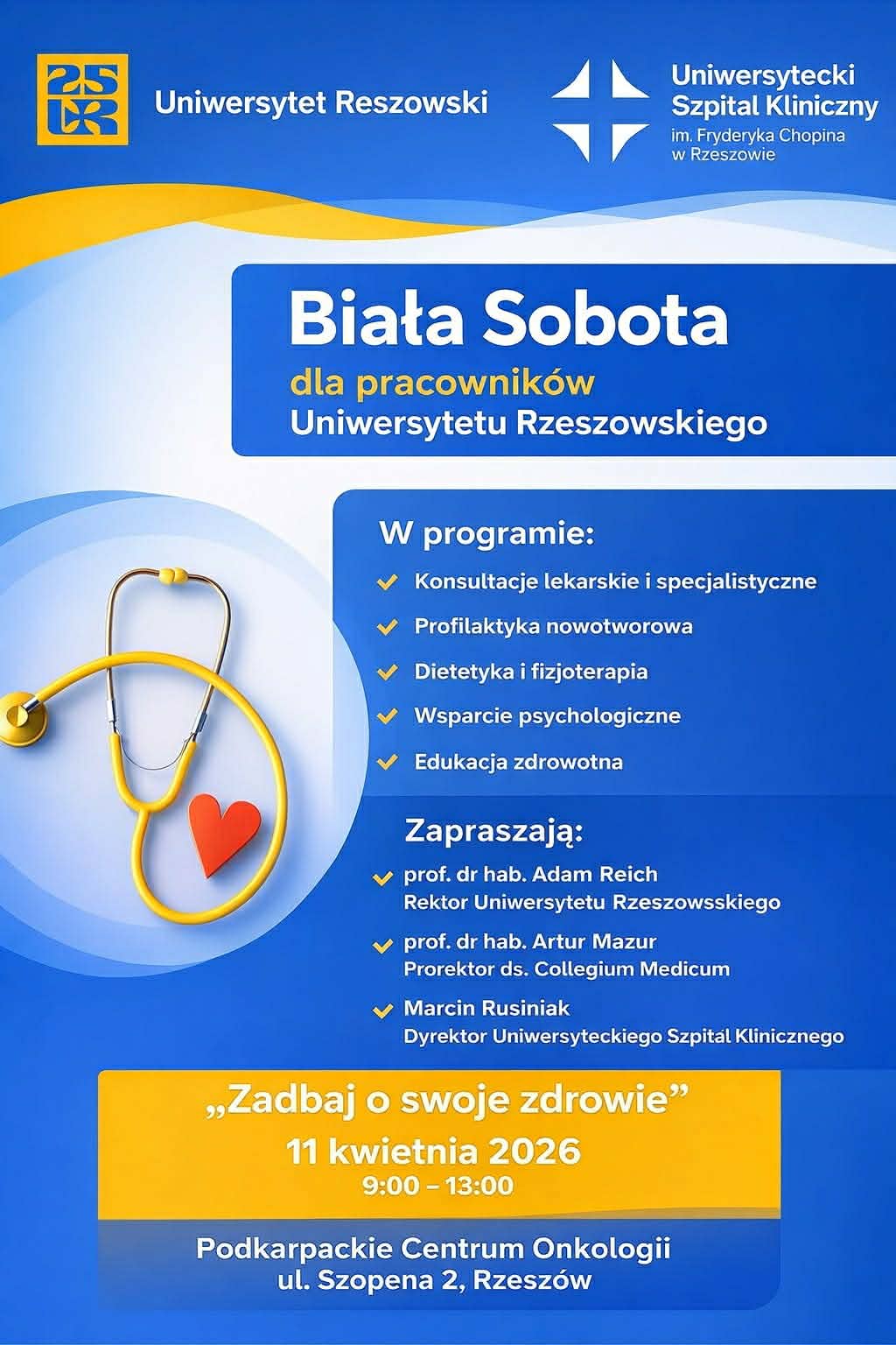 11 kwietnia 2026 r. w godzinach 9:00–13:00 w Uniwersyteckim Szpitalu Klinicznym im. Fryderyka Chopina w Rzeszowie odbyło się wyjątkowe wydarzenie profilaktyczno-edukacyjne „Biała Sobota”, skierowane do pracowników Uniwersytetu Rzeszowskiego. Inicjatywa została zorganizowana we współpracy obu instytucji i stanowiła element obchodów jubileuszu 25-lecia Uniwersytetu.
