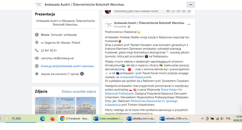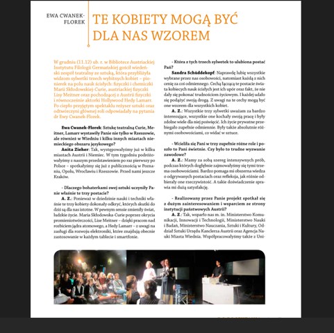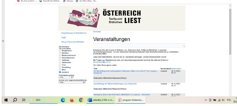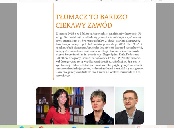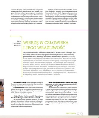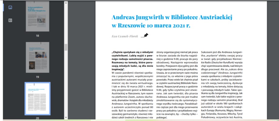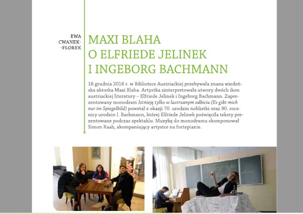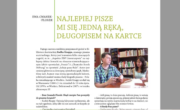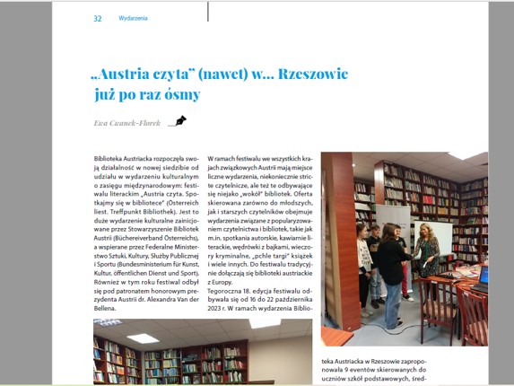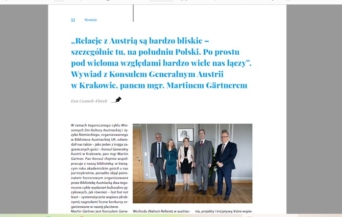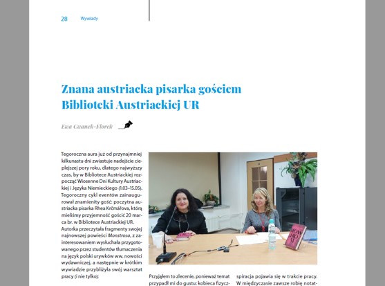 Ponadto na temat każdego większego wydarzenia BA jest zamieszczana relacja w „Gazecie Uniwersyteckiej”. Dodatkowo z większością zagranicznych gości biblioteki jest przeprowadzany wywiad, który jest publikowany w „Gazecie Uniwersyteckiej”. Do tej pory ukazały się wywiady z: konsulem generalnym Austrii Martinem Gärtnerem, aktorką Maxi Blahą, dwoma grupami teatralnymi z Wiednia, byłym ambasadorem i badaczem śladów polskich w Wiedniu – dr Jakubem Forst-Battaglią, tłumaczami Ryszardem Wojnakowskim oraz Agnieszką Walczy, a także zapis rozmów z współczesnymi pisarzami austriackimi: Rheą Krcmarovą, Andreasem Jungwirthem, Karin Peschką, Reinhardem Kaiser-Mühleckerem, Radkiem Knappem, Caroliną Schutti.