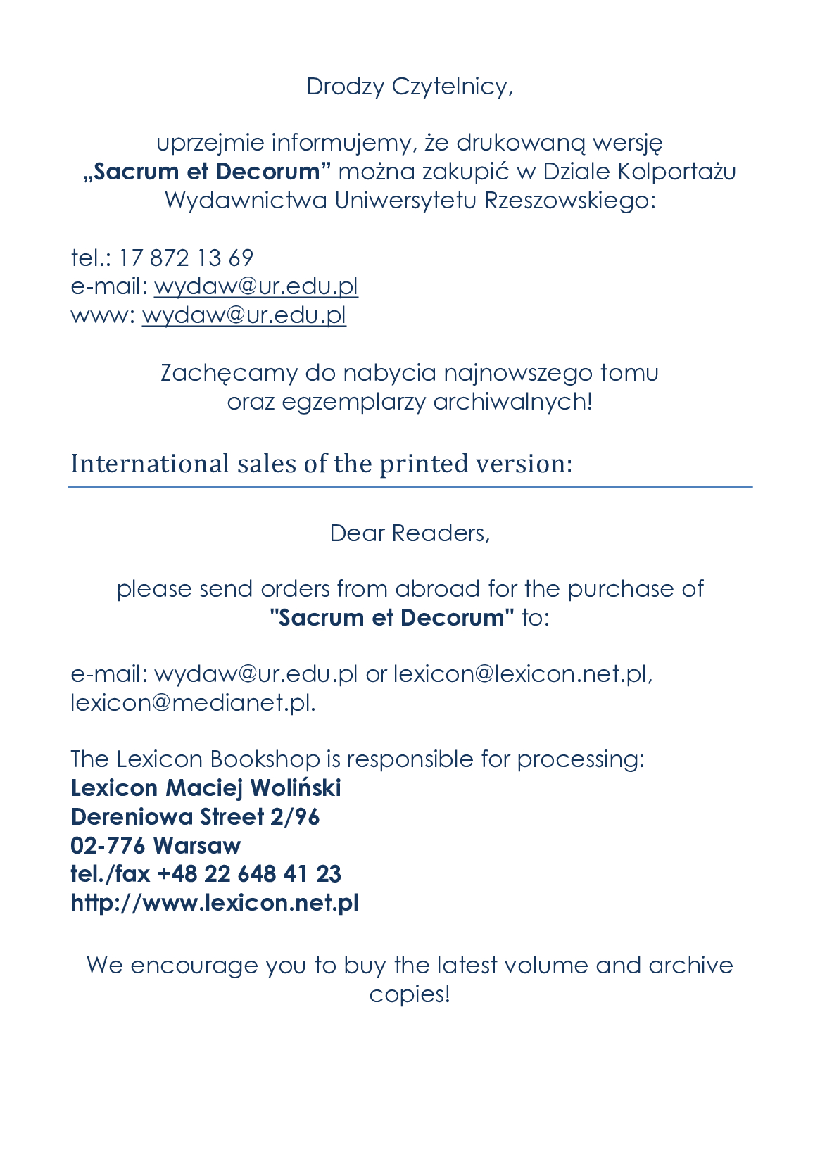Od ponad miesiąca najnowsze siedemnaste wydanie "Sacrum et Decorum", 2024 jest już dostępne na platformie OJS - https://journals.ur.edu.pl/setde i, fragmentarycznie, na Facebooku czasopisma. Jakkolwiek jego elektroniczna odsłona cieszy się coraz większą popularnością, to nie brakuje czytelników czekających na bibliofilskie wydanie drukowane. I oto jest - przywiezione z Drukarni Mitel - jeszcze cieplutkie i pachnące farbą drukarską, a co najważniejsze cieszące zmysły jak zawsze piękną edycją. Okładkę tomu zdobi Pantokrator będący fragmentem ikonostasu autorstwa ukraińskiej malarki na szkle Oksany Wynnyczok do kaplicy klasztoru Bazylianów Przemienienia Pańskiego we wsi Dzembronia w Ukrainie. Autorką zdjęcia jest Oksana Triska z Narodowej Akademii Nauk Ukrainy, której artykuł "Huculsko-pokuckie ikony ludowe na szkle jako źródło inspiracji dla współczesnego ukraińskiego malarstwa i ikonopisarstwa" jest jednym z siedmiu tekstów prezentowanych w aktualnym numerze. Zwolenników wertowania stron i kolekcjonerów wydań bibliofilskich zapraszamy do zakupu "Sacrum et Decorum".