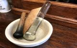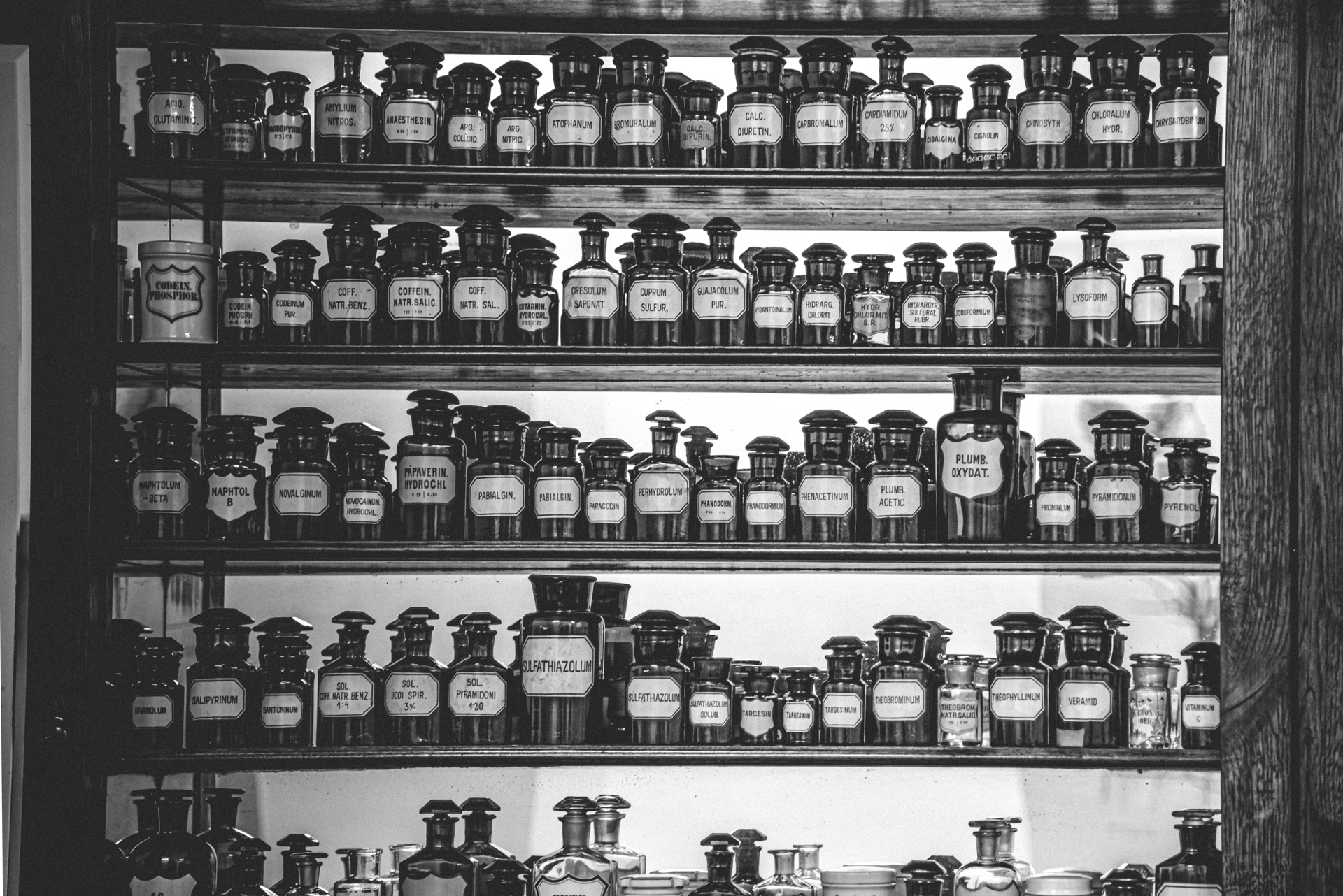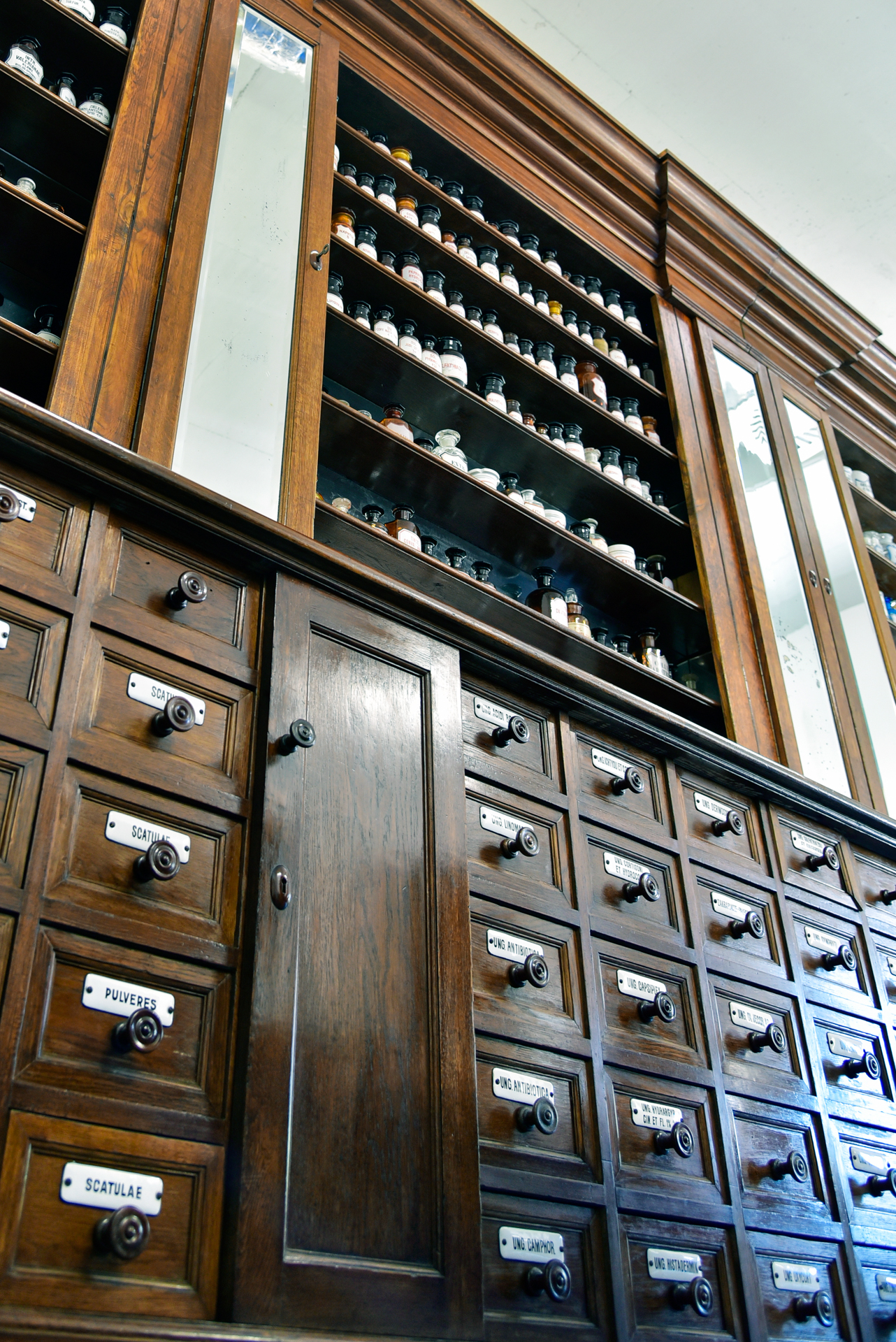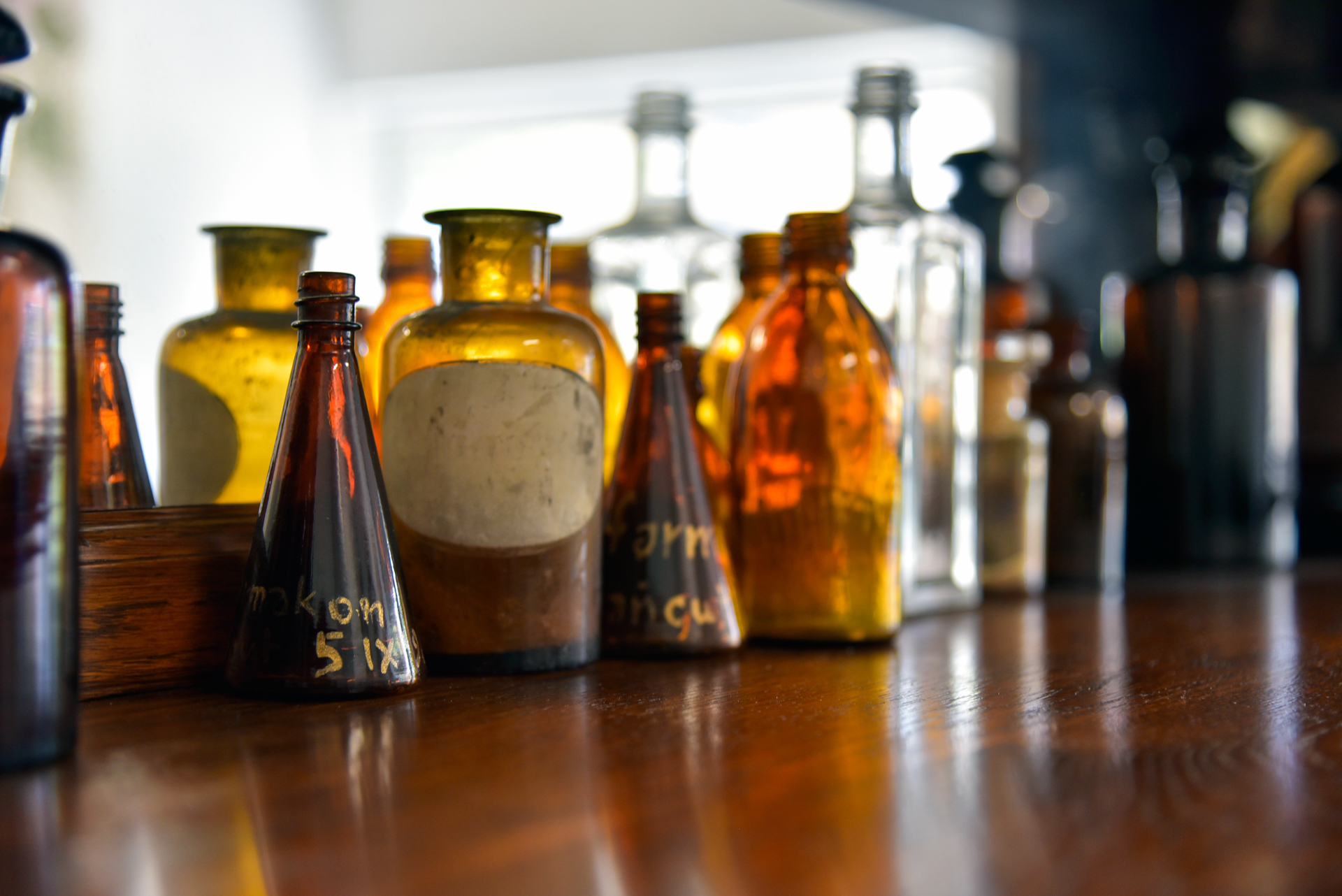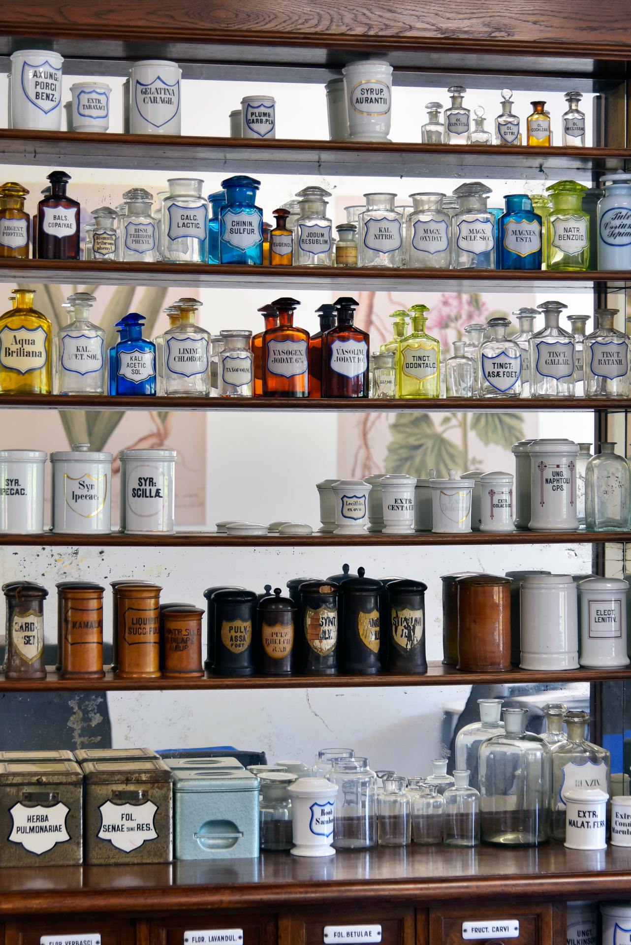 Na masywnych regałach ułożone są butelki i buteleczki najróżniejszych rozmiarów i kolorów. Za ladą widać dziesiątki malutkich szafeczek, w których kryją się różne lekarstwa i zioła. Na ladach stoją wagi potrzebne do odmierzania prawidłowej ilości leku lub korzeni.