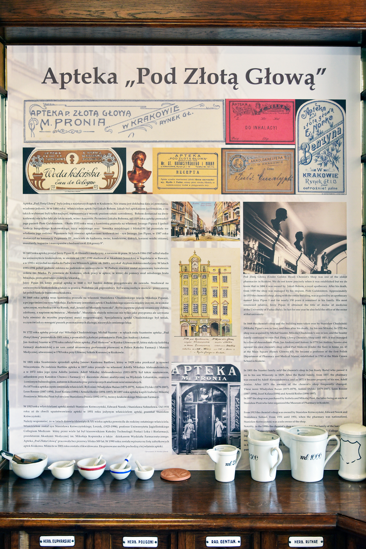 Apteka „Pod Złotą Głową” była jedną z najstarszych aptek w Krakowie. Nieznana jest dokładna data jej powstania, wiadomo jedynie, że w 1484 roku jej właścicielem był Jakub Bohem, aptekarz królewski, a na takich wybierani byli tylko najlepsi, reprezentujący wysoki poziom sztuki zawodowej. Bohem dostarczał na dwór królewski nie tylko leki, ale także wosk, wino i korzenie. Po śmierci Jakuba Bohema od 1509 roku aptekę prowadził jego pasierb Piotr Guldenstern. Około 1533 roku wraz z kamienicą przeszła na własność Jerzego Pipana I (pełnił funkcję burgrabiego krakowskiego, rajcy miejskiego oraz ławnika miejskiego) i przez 150 lat pozostała we władaniu jego rodziny. Pipanowie byli również aptekarzami królewskimi – syn Jerzego, Jan Pipan, w 1587 roku dostarczył na koronację Zygmunta III „trociczek do kadzenia, świec, konfektów, daktyli, korzeni wódki różanej, musztardy, kaparów i marcepanów z herbami za zł 114, groszy 9”.
