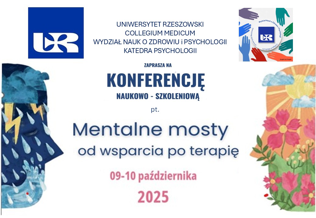 Z okazji Światowego Dnia Zdrowia Psychicznego serdecznie zapraszamy do udziału w Ogólnopolskiej Konferencji Naukowo-Szkoleniowej „MENTALNE MOSTY – od wsparcia po terapię”, organizowanej przez Katedrę Psychologii Wydziału Nauk o Zdrowiu i Psychologii Uniwersytetu Rzeszowskiego we współpracy z Polskim Towarzystwem Terapii Dialektyczno-Behawioralnej.
