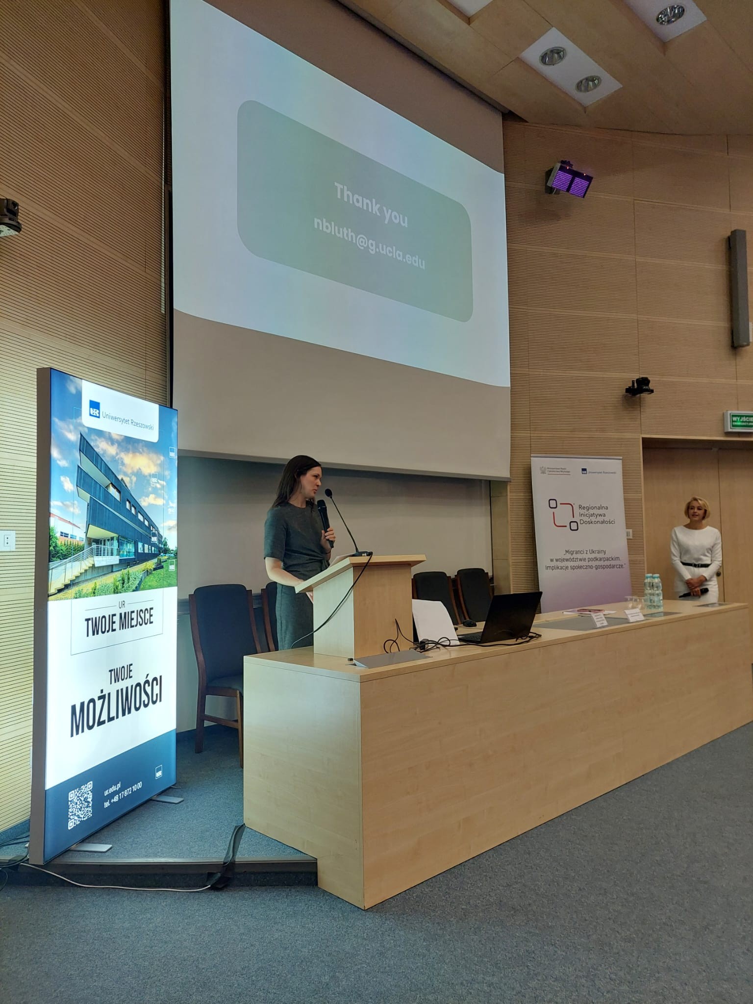 W dniu 18 listopada 2025 r. na Uniwersytecie Rzeszowskim, w ramach projektu Regionalnej Inicjatywy Doskonałości „Migranci z Ukrainy w województwie podkarpackim. Implikacje społeczno-gospodarcze”, odbyło się seminarium pt. „Two Axes of Family Separation: How Ukrainian migrant women manage marital relations and motherhood during Russia's war”. Spotkanie otworzył wykład Natashy Bluth, doktorantki Uniwersytetu Kalifornijskiego w Los Angeles (USA).