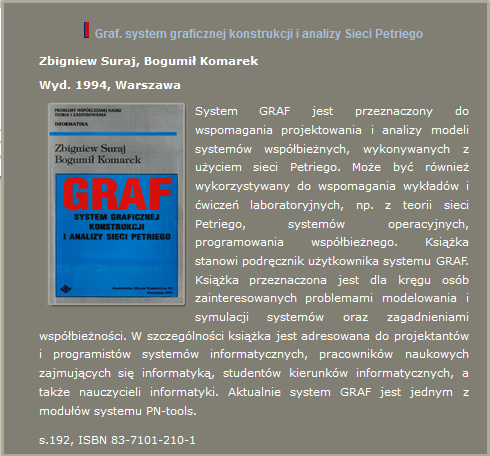 - Suraj, Z., Komarek, B.: GRAF. System graficznej konstrukcji i analizy sieci Petriego, Seria: Problemy Współczesnej Nauki. Teoria i Zastosowania: Informatyka, Akademicka Oficyna Wydawnicza PLJ, Warszawa, 1994, stron 190.