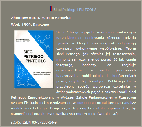 - Suraj, Z., Szpyrka, M.: Sieci Petriego i PN-tools, Wydawnictwo Wyższej Szkoły Pedagogicznej, Rzeszów, 1999, stron 147.