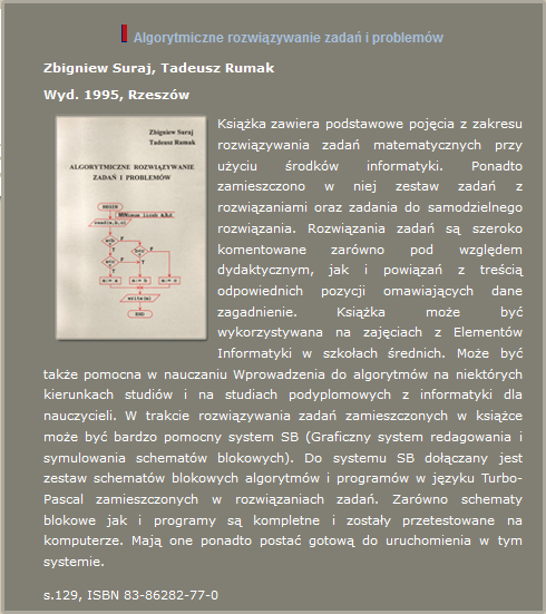 - Rumak, B., Rumak, T., Suraj, Z., Zima, M.: Algorytmy i programy z uwzględnieniem równań i nierówności ax + b = 0, ax + b ≥ 0, ax + b ≤ 0, WSP, Rzeszów 1988.