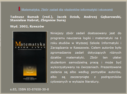 - Suraj, Z. (współautor): Matematyka. Zbiór zadań dla studentów informatyki i ekonometrii (pod red. T. Rumaka), Wyższa Szkoła Informatyki i Zarządzania z siedzibą w Rzeszowie, Rzeszów 2002, stron 83.