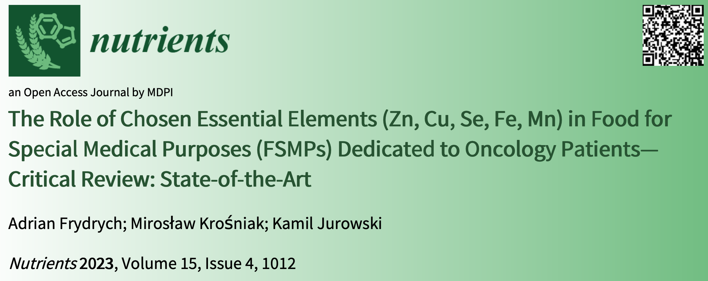 [współaut.] Krośniak M, Jurowski K The Role of Chosen Essential Elements (Zn, Cu, Se, Fe, Mn) in Food for Special Medical Purposes (FSMPs) Dedicated to Oncology Patients - Critical Review : State-of-the-Art. - Nutrients, 2023, Vol. 15, iss. 4