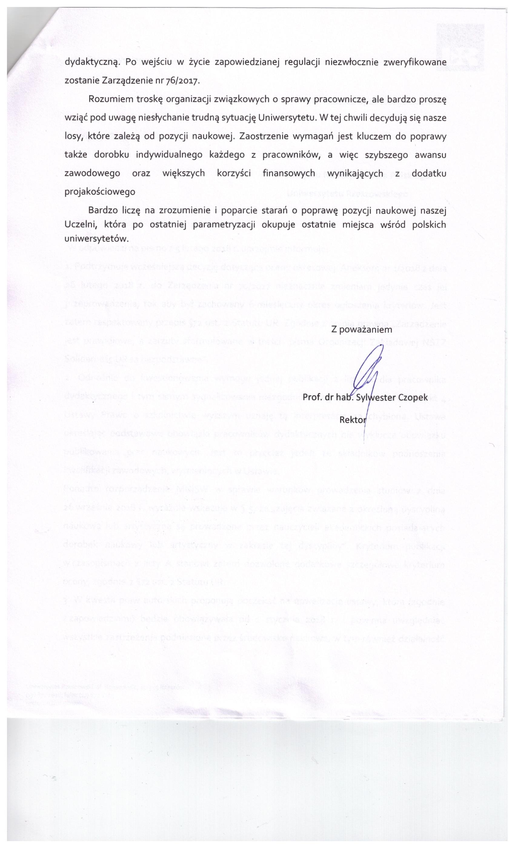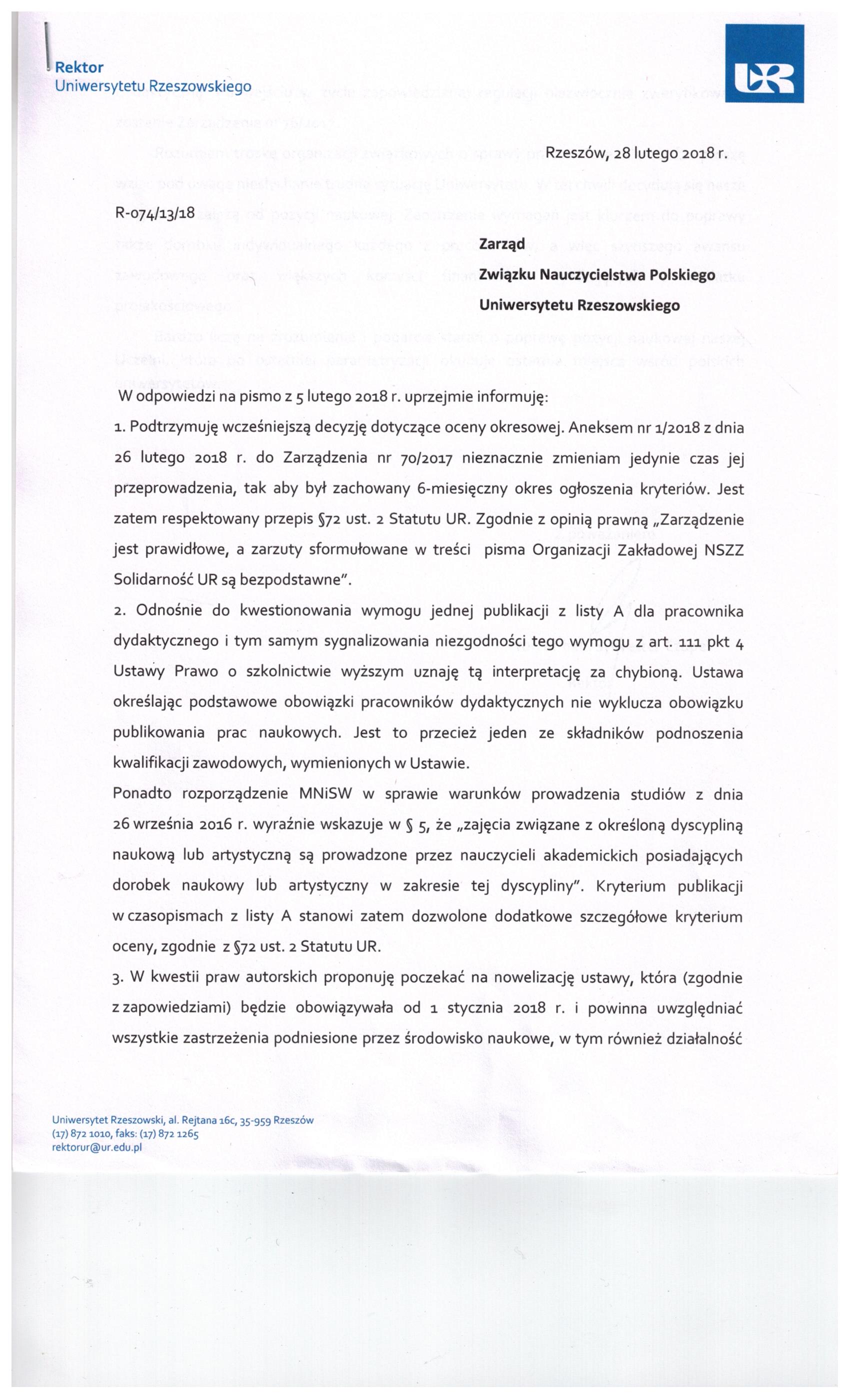 Odpowiedź Pana Rektora na pismo z dnia 5 lutego 2018 r. strona 1, strona 2
