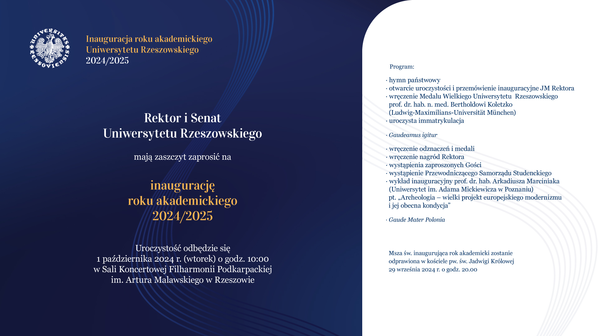 Rektor i Senat Uniwersytetu Rzeszowskiego mają zaszczyt zaprosić do wcięcia udziału w uroczystej Inauguracji roku akademickiego 2024/2025 Uniwersytetu Rzeszowskiego.