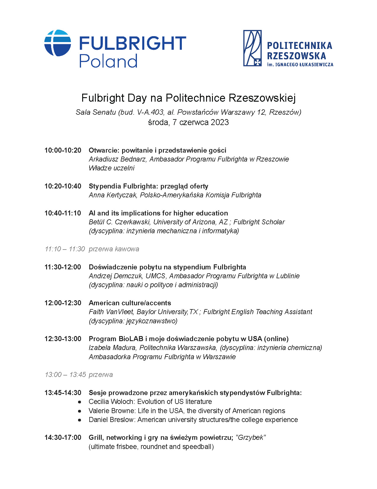 Już 7 czerwca, w godzinach od 10.00 do 17.00, będzie można posłuchać o ofercie stypendialnej, doświadczeniach i możliwościach stażowych w ramach aktywności Polsko-Amerykańskiej Komisji Fulbrighta. W ramach wystąpień o doświadczeniach będą przemawiały osoby z następujących dziedzin: inżynieria mechaniczna, informatyka, nauki o polityce i administracji, inżynieria chemiczna, językoznawstwo i literatura. Gościnnie wystąpi 5 amerykańskich stypendystów Fulbrighta i trzech Ambasadorów Programu Fulbrighta. Prezentacje obejmują takie tematy jak: sztuczna inteligencja, różnice w akcencie w zależności od regionu Stanów Zjednoczonych, struktura administracji prezydenta USA i wiele innych.