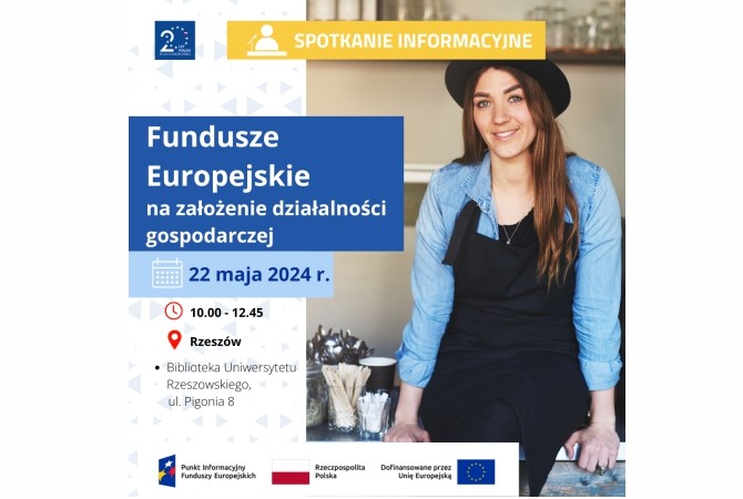 Główny Punkt Informacyjny Funduszy Europejskich w Rzeszowie zaprasza na bezpłatne spotkanie informacyjne „Fundusze Europejskie na założenie działalności gospodarczej”. Spotkanie odbędzie się 22 maja 2024 r., w godz. 10.00-12.45 w siedzibie Biblioteki Uniwersytetu Rzeszowskiego, przy ul. S. Pigonia 8, 35-959 Rzeszów (sala konferencyjna).