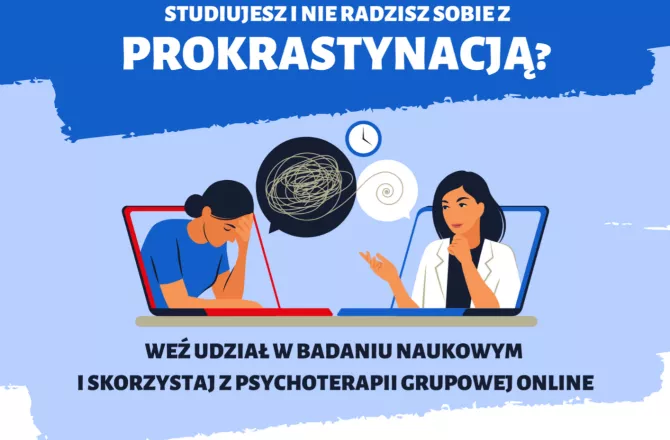 Jeżeli tak, to, zapraszamy Cię do udziału w 5-tygodniowej psychoterapii grupowej online, której celem jest redukcja poziomu prokrastynacji. Sesje terapeutyczne prowadzone przez wykwalifikowanych terapeutów będą odbywały się raz w tygodniu (łącznie 5 spotkań). Psychoterapia będzie odbywać się w listopadzie i grudniu. Psychoterapia jest skierowana do osób, które w tym czasie będą realizowały w ramach studiów długotrwały, wymagający systematycznej pracy projekt w postaci np. pracy magisterskiej/licencjackiej, pracy rocznej, egzaminu obejmującego szeroki zakres materiału. Posiadanie konkretnego celu związanego z projektem jest warunkiem koniecznym uczestnictwa w terapii.