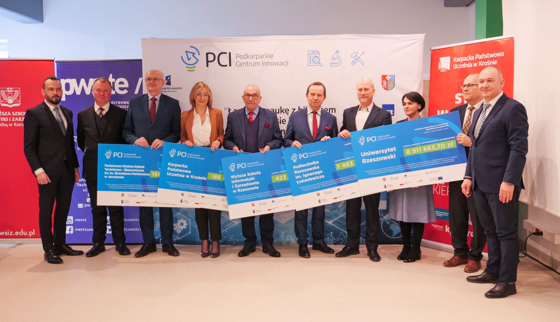 Niemal 9 mln dla Uniwersytetu Rzeszowskiego, ponad 7 mln dla Politechniki Rzeszowskiej, prawie pół miliona dla WSIiZ i po blisko 200 tysięcy dla PWSTE w Jarosławiu oraz KPU w Krośnie. 23 lutego, Marszałek Województwa Podkarpackiego Władysław Ortyl wręczył symboliczne czeki na granty, które pięć uczelni z regionu otrzymało w ramach III naboru do Programu grantowego PCI.